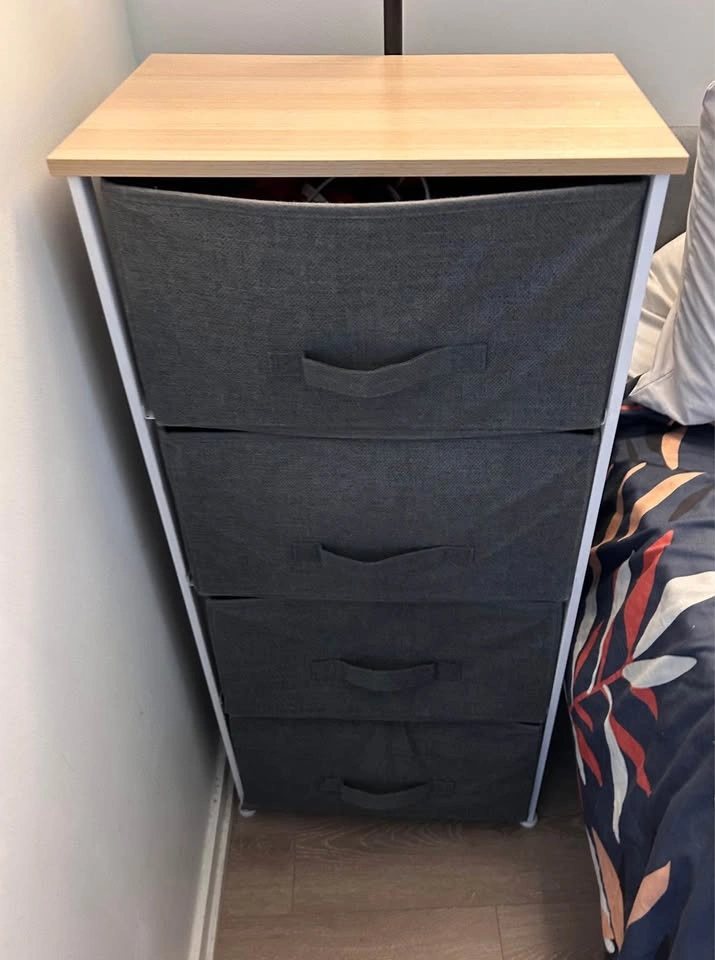 Selling a handy 4-drawer storage dresser! It's perfect for organizing clothes or other items in a small space. The dresser has a light wood top and grey fabric drawers, with a slim profile that fits nicely next to a bed or in a closet. It's in great condition and ready for a new home! Pick up near bay and temperance