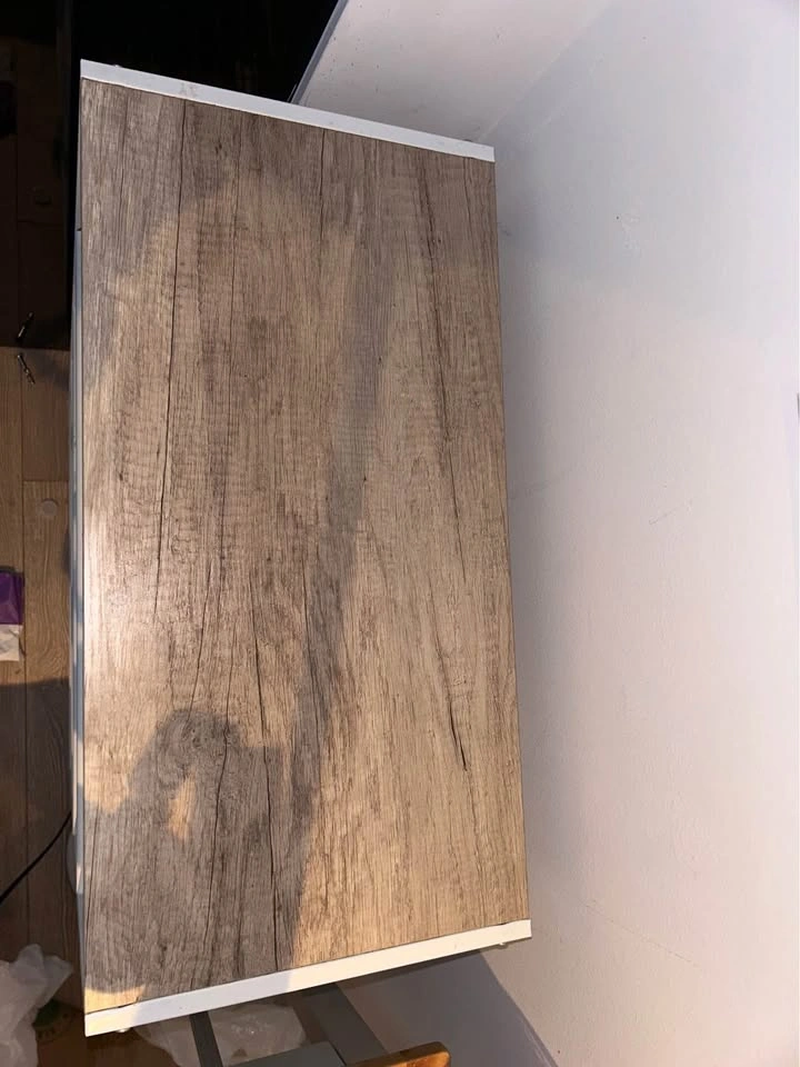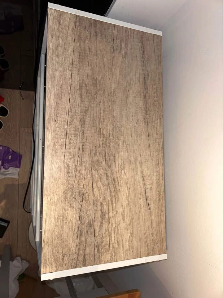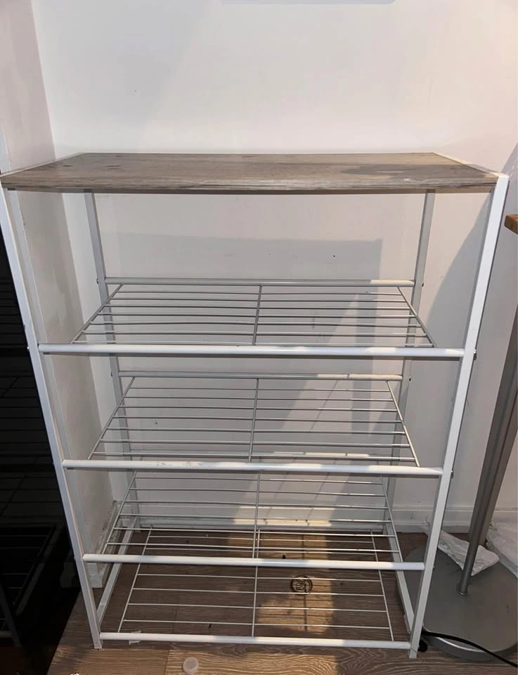 Here's a shelf unit 5 tier with a wood-look top and white metal frame. It's in great shape and ready to organize your space! Pick up near Bay and Temperance