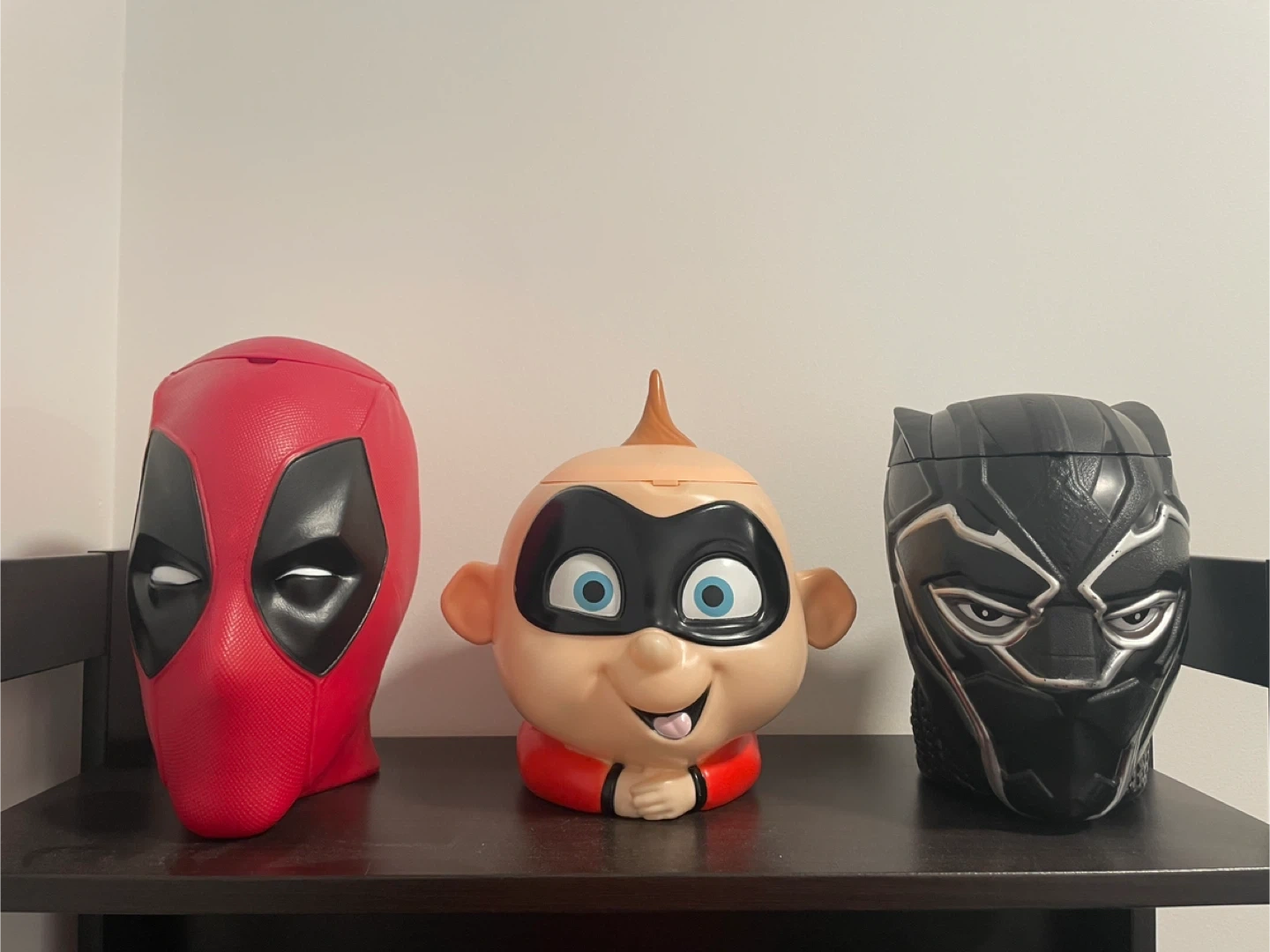 Selling three fun popcorn buckets! There's Deadpool, Jack-Jack from The Incredibles, and Black Panther. Perfect for movie nights or Marvel fans $10 each