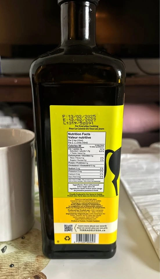 Selling a bottle of Terra Delyssa Extra Virgin Olive Oil. It's a first cold press oil, perfect for everyday cooking. The bottle contains 1L (34 fl oz). Expiry Date: 2027 February 12. Sealed
