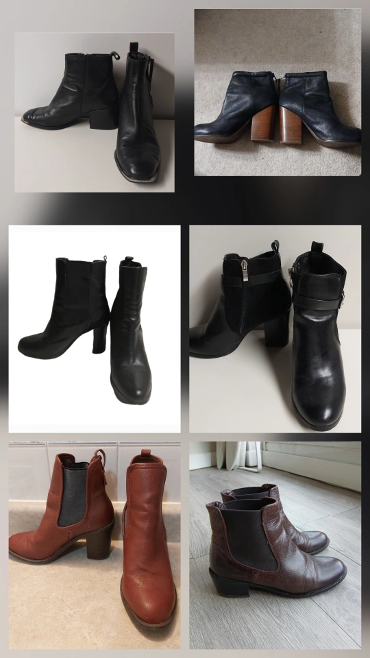 🏠Pickup by Front and Spadina typically in the evenings. Can sometimes meet by Yonge and College or Yonge and Dundas during the day on a weekday Lots of different booties (short boots) for sale. Please read carefully below for pricing - Aldo black shiny booties with silver square toes size 8 ($27) - leather size 8 booties with brown heel size 7.5 ($95) - Joe Fresh black booties size 7 ($23) - Joyce black shiny booties size 8.5 ($90) - reddish brown leather booties size 8.5 ($40) - Artica chelsea style brown booties size 8 ($45)