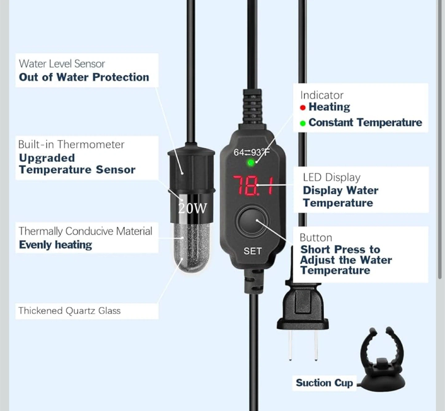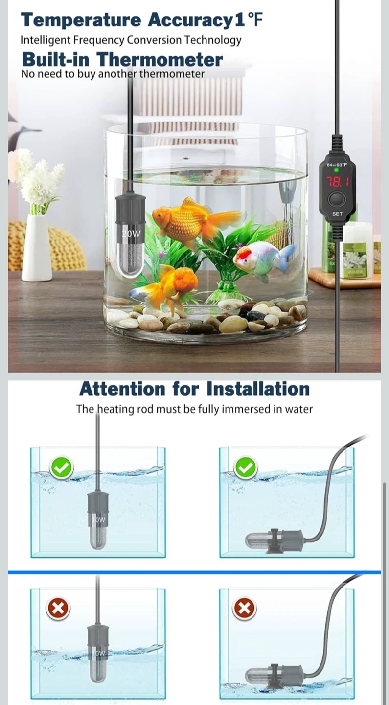 Keep your aquatic friends happy with this 20W aquarium heater! It features a built-in thermometer and an upgraded temperature sensor, so you don't need to buy a separate thermometer. The thermally conductive material ensures even heating, and the thickened quartz glass adds durability. Just remember, the heating rod must be fully immersed in water for safe and effective use