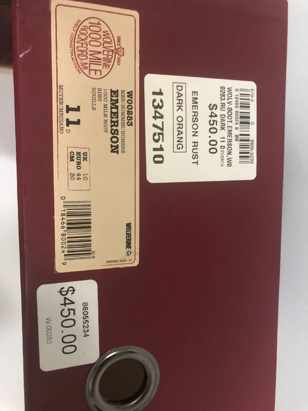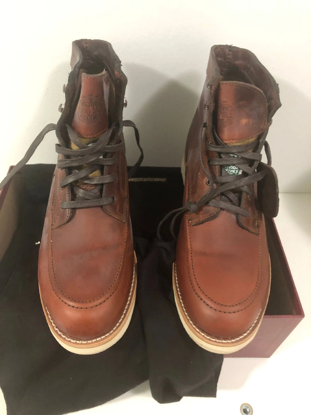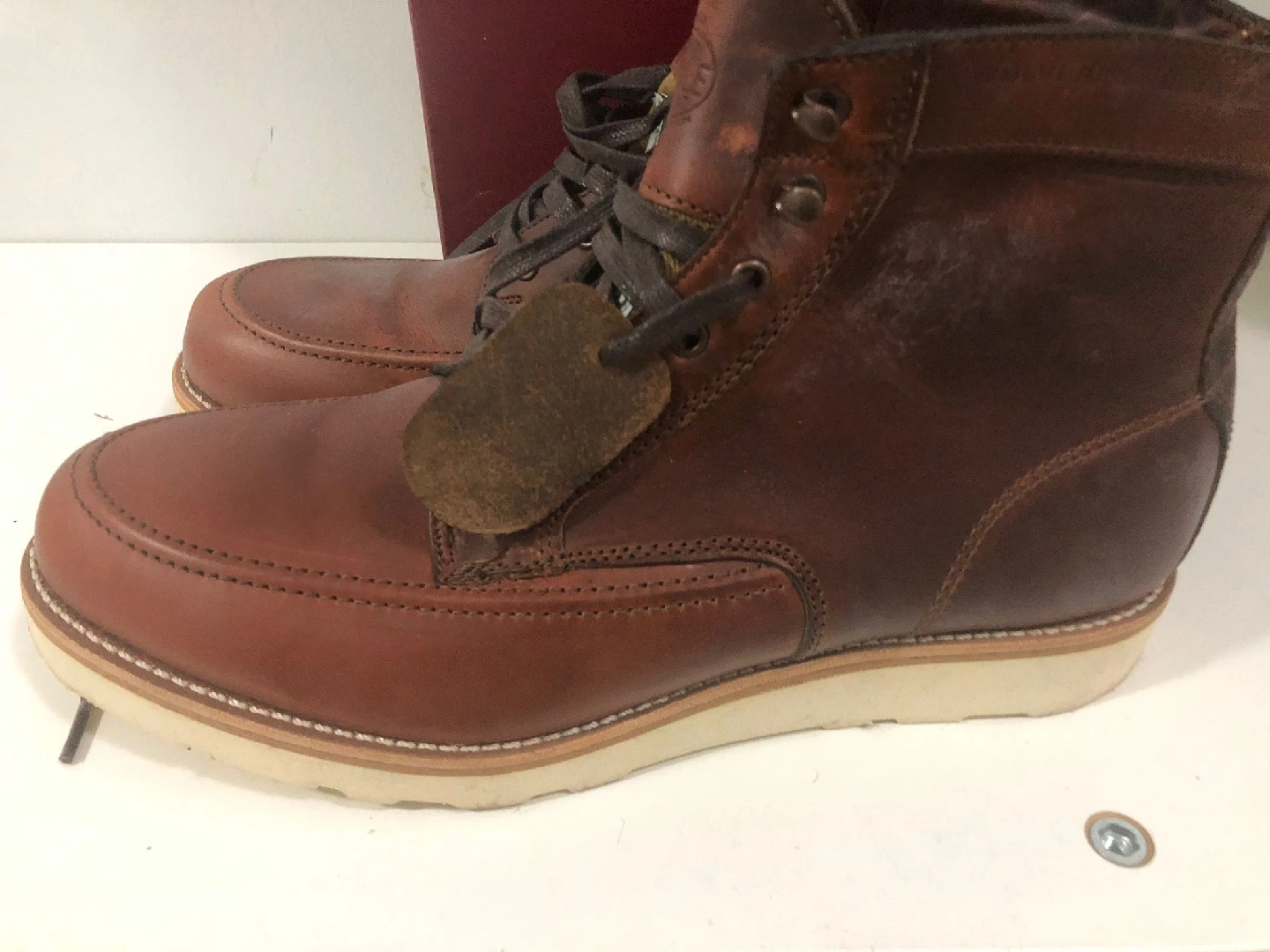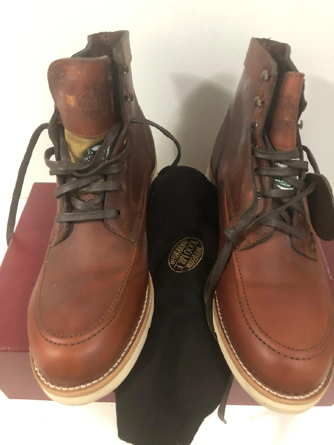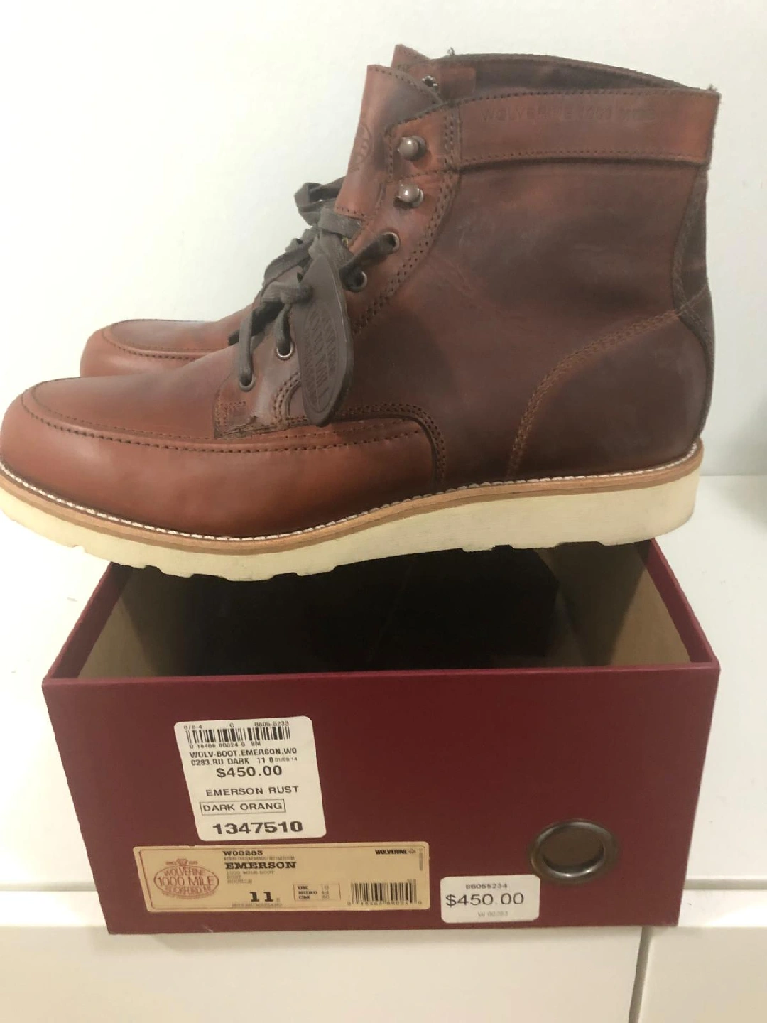 Selling a pair of Wolverine 1000 Mile Emerson boots in size 11. These boots are a dark orange/rust colour and come with the original box. Originally priced at $450. They're in good condition and ready for a new home!