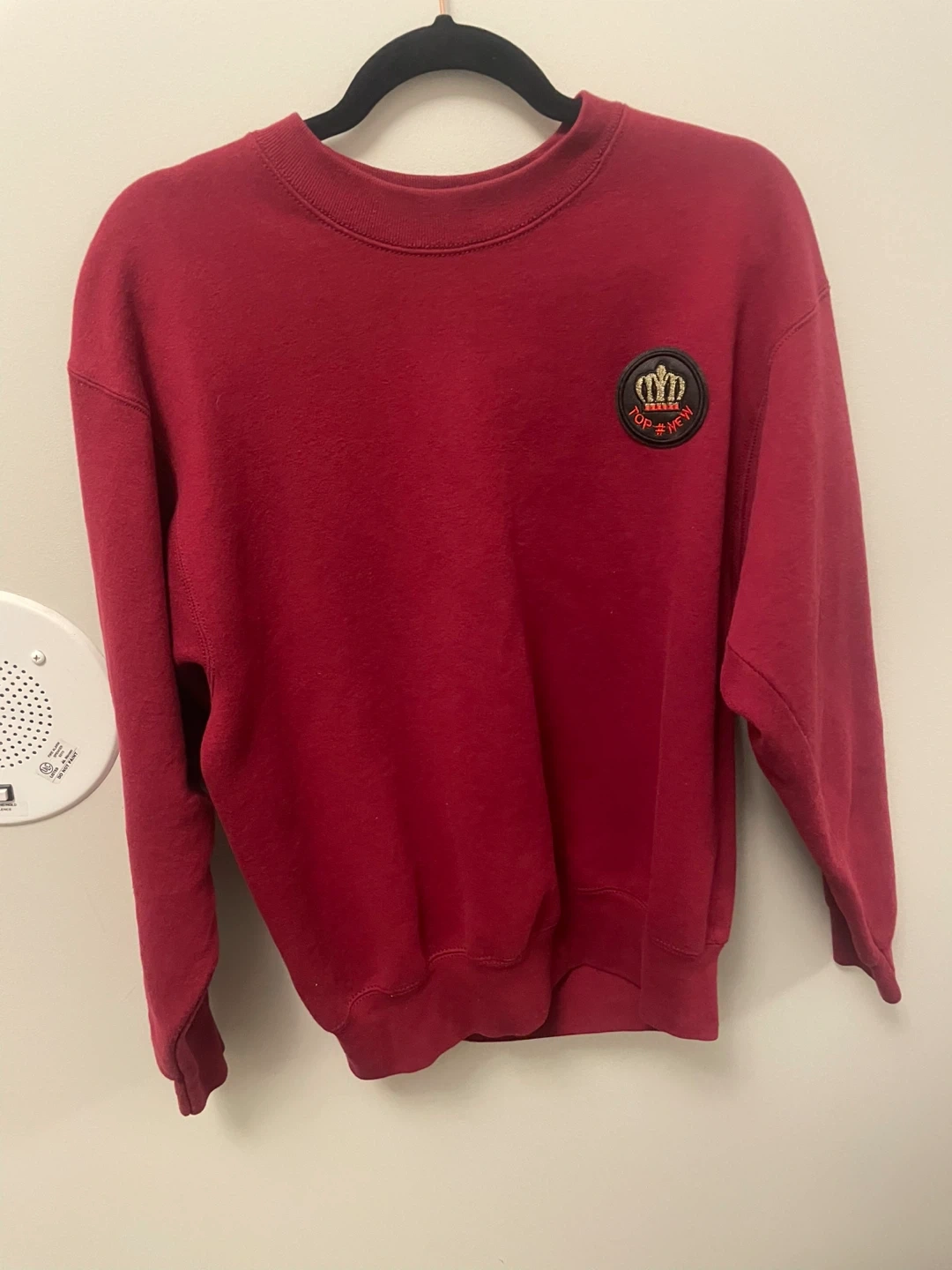 Cozy red crewneck sweatshirt in great condition! The sweatshirt features a round patch with a crown design and the text "TOP #NEW". It's perfect for staying warm and stylish during cooler weather. A great addition to any wardrobe!