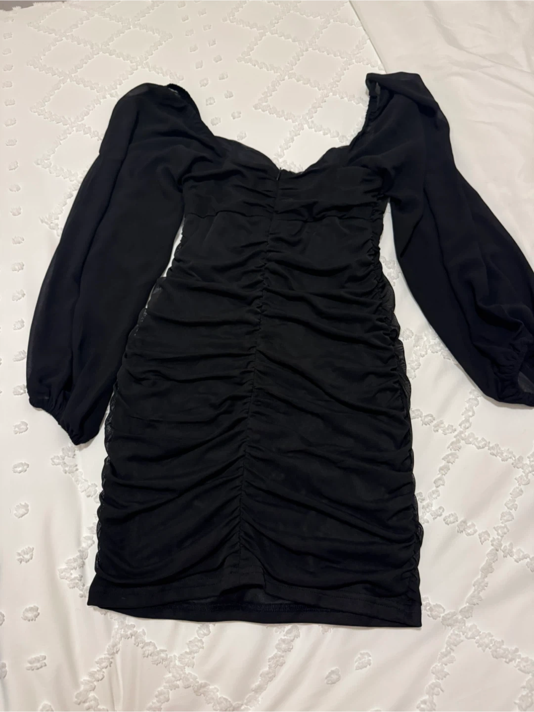 Selling a cute black mini dress with long sleeves! It's in great condition and perfect for a night out or special occasion. The dress features a flattering ruched design and a deep V-neckline. It's a size medium and made of a comfortable, stretchy material. It's a stylish and versatile piece to add to your wardrobe