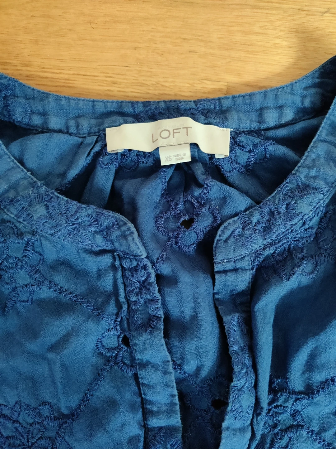 Brand is Loft by Ann Taylor Size XS blue colour 100% cotton shirt with 100% polyester detailing Used maybe once and washed. Good used condition. Might have slight signs of wear, but hardly noticeable. #freecycle