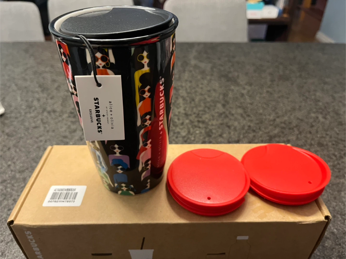 Selling a Starbucks tumbler in collaboration with Alice + Olivia! It's an exclusive design. Comes with the original box. **Includes 2 extra red colour lids. These lids are brand new from my other 2 tumbler which were broken during shipping** Preferred pick up Derry Rd./ Tenth Line in Mississauga