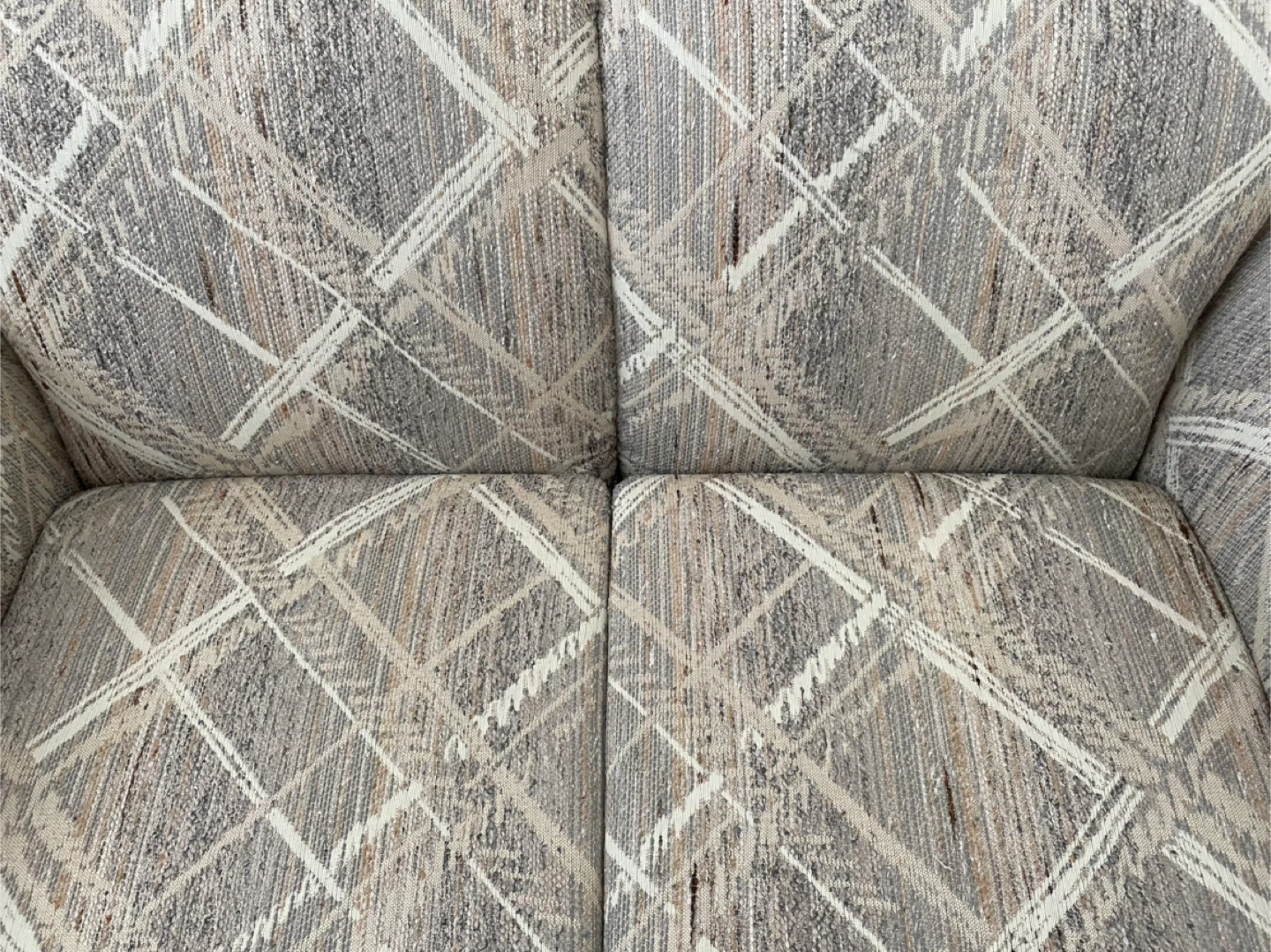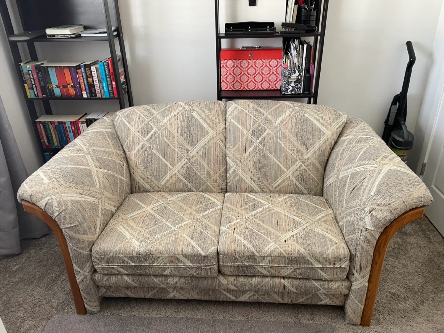 Vintage couch looking for a new home! Non smoking, no pets, in good condition. $150.00 or best offer! It features a patterned fabric design and wooden armrests. Perfect for a small space! Height= 32" Length= 64" Width= 34.5"