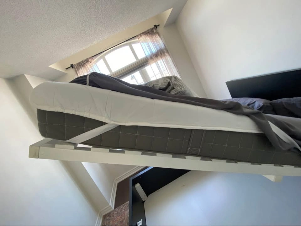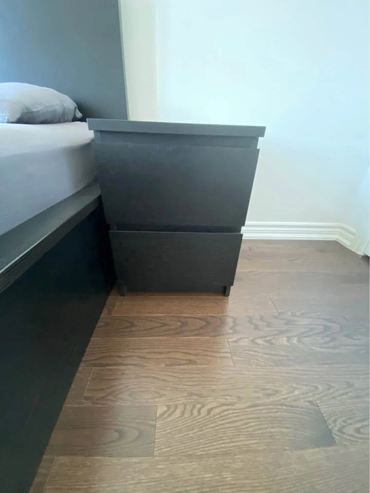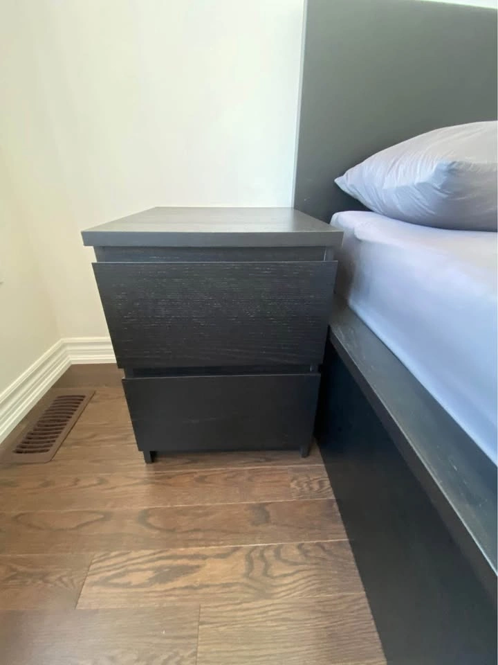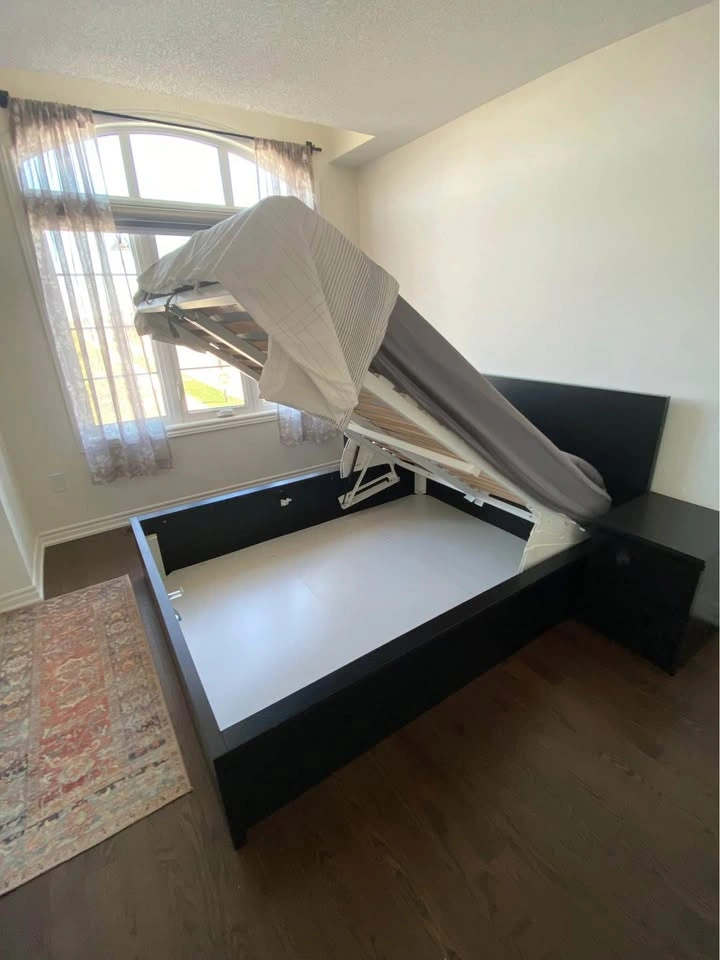 Enhance your bedroom with this modern queen bed featuring a convenient hydraulic lift for easy under-bed storage. Plenty of room for bedding, luggage, or seasonal items. Set includes two matching black nightstands with deep drawers and comfortable queen mattress - Queen size platform bed with hydraulic lift for storage - Ample and clean under-bed storage space - Includes 2 nightstands (matching, 2 drawers each) - Includes 1 lightly used queen mattress (clean, gently used) - Sturdy construction, contemporary design - Easy pickup in Milton, ON - Perfect for guest room, main bedroom, or upgrades Available as a set or separate. Priced to sell quickly: - Bed frame: $350 - Pair of nightstands: $100 - Mattress : $120 Open to reasonable offers. Message for more details or to arrange viewing.