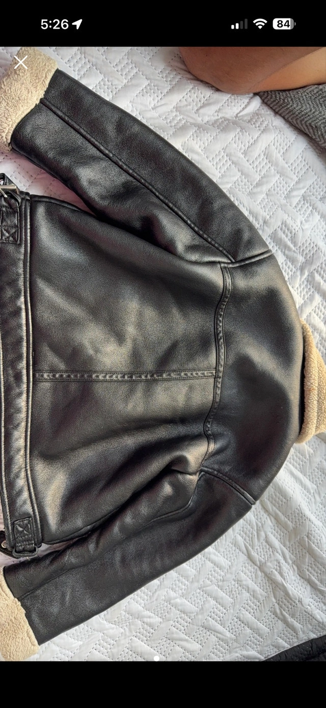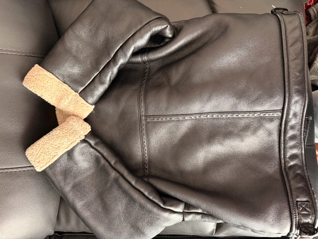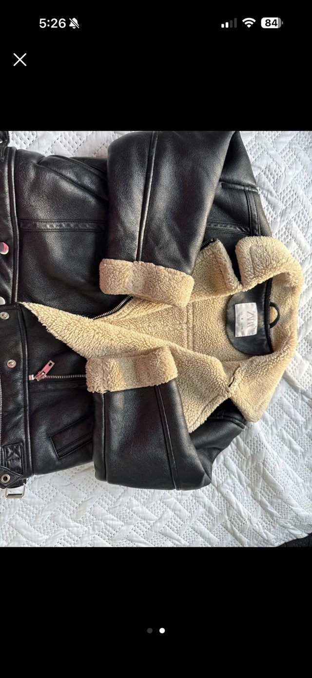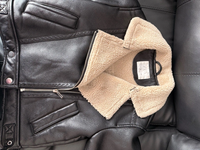 This is a Zara black faux-leather jacket with a cozy, cream-coloured faux-shearling lining, perfect for stylish warmth. This used Zara jacket is in great condition. It features a classic aviator design with an asymmetrical zip closure and side pockets. Here are some additional details: * Brand: Zara * Material: Faux leather with faux-shearling lining * Style: Aviator/Biker * Closure: Zipper * Pockets: Two side pockets Just a friendly reminder: if the ad is up, the Zara jacket is available! Looking at similar items on Kijiji, I'm pricing this jacket at $50 CAD. Originally bought 250 slightly used. As - is