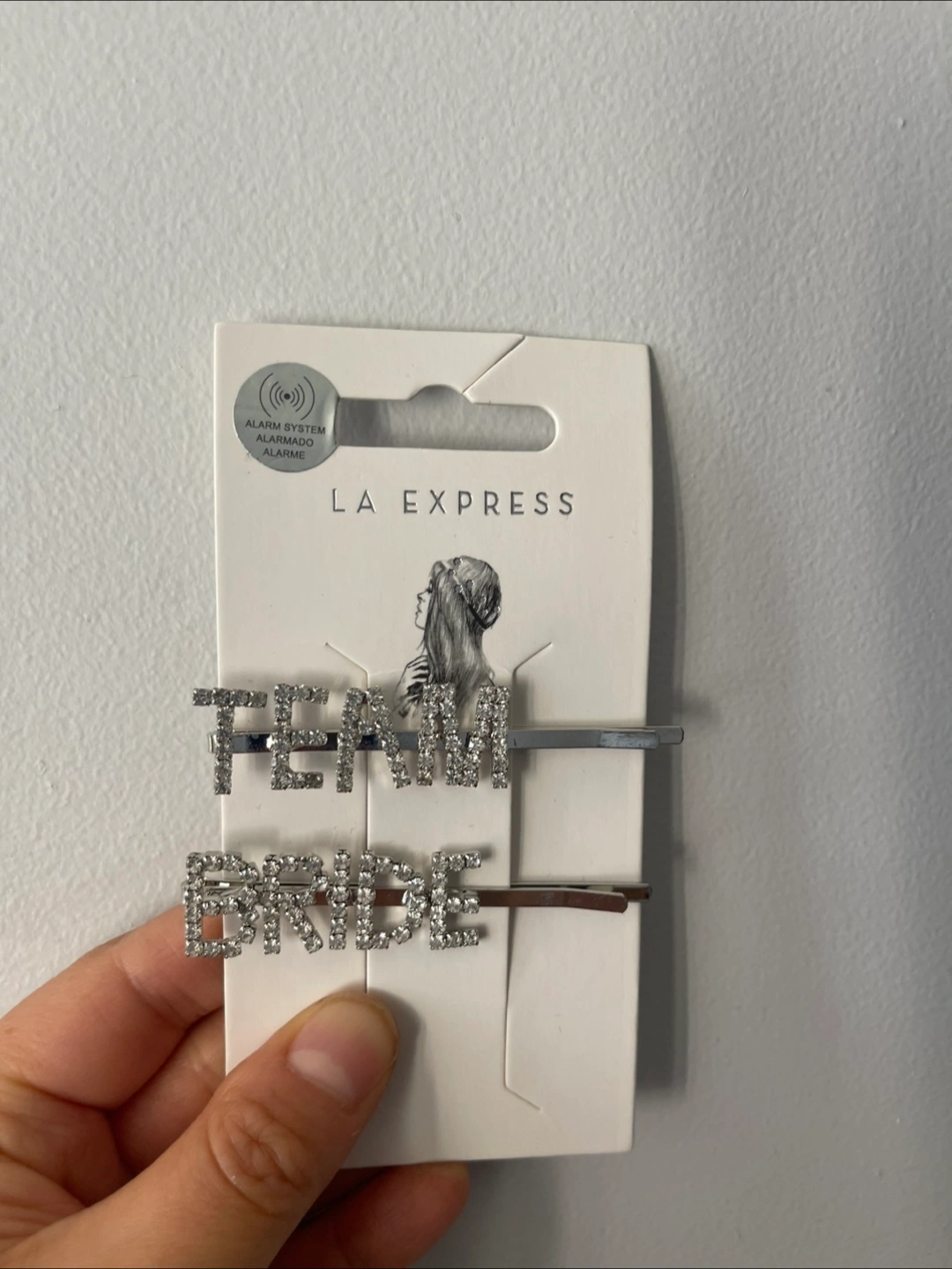 These hair pins are perfect for a bride or her team! They are brand new and still in the original packaging. One pin says 'Team' and the other says 'Bride'. Cute for a bachelorette or wedding day