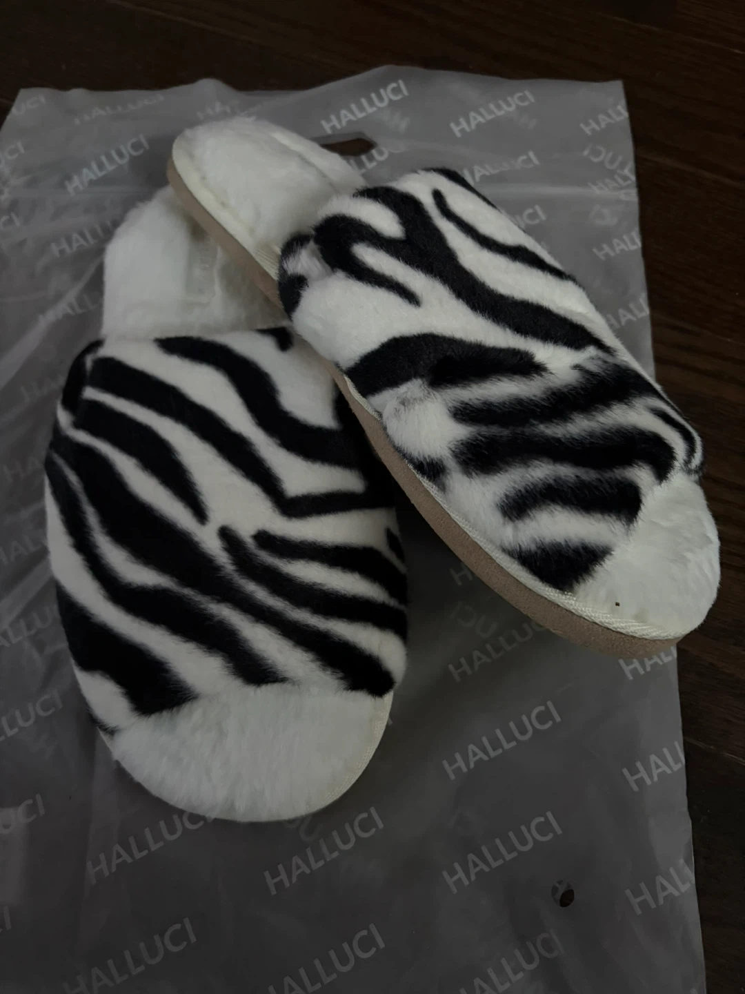 Cozy up with these Halluci slippers! They feature a fun zebra print design and are a size 8/9Perfect for keeping your feet warm and comfy around the house