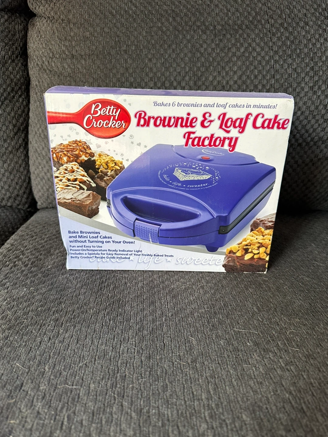 Betty Crocker Brownie & Loaf Cake Factory! It bakes brownies and loaf cakes in minutes without turning on your oven. It also has a power on/temperature ready indicator light. Recipe guide included and comes with the box. Unopened never used