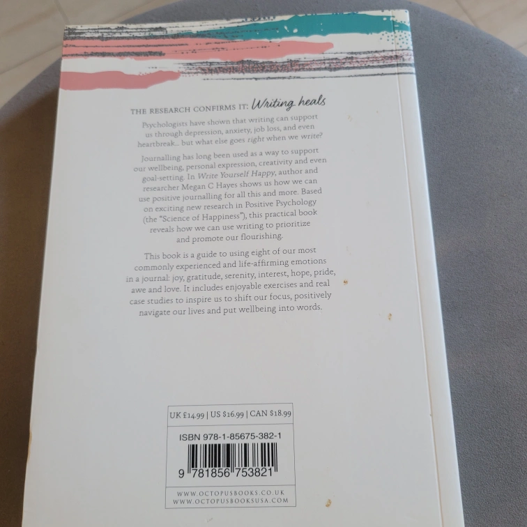 I'm selling the book 'Write Yourself Happy: The Art of Positive Journalling' by Megan C Hayes PhD. It's a guide to using our most commonly experienced and life-affirming emotions in a journal: joy, gratitude, serenity, interest, hope, pride, awe and love. It includes enjoyable exercises and real case studies to inspire us to shift our focus, positively navigate our lives and put wellbeing into words. Originally priced at $18.99 CAD