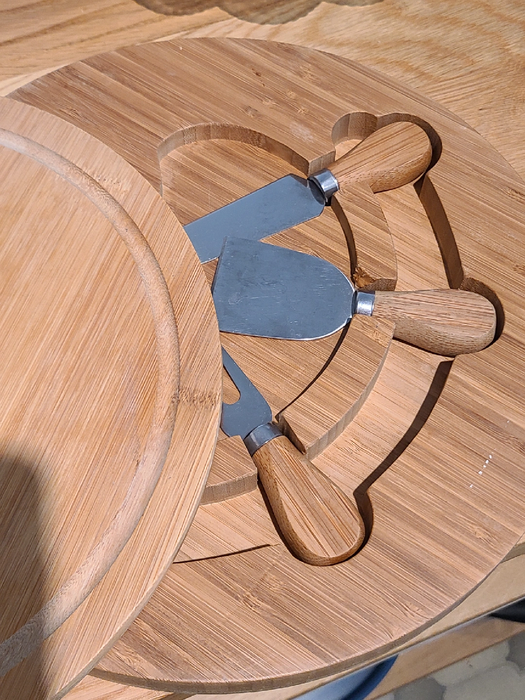 Selling a lovely bamboo cheese board set! It includes a round cheese board and three cheese knives. Perfect for entertaining or a cozy night in with your favourite cheeses and snacks. missing 1 cheese knife From a pet-free, smoke-free home Porch pickup near Bathurst station