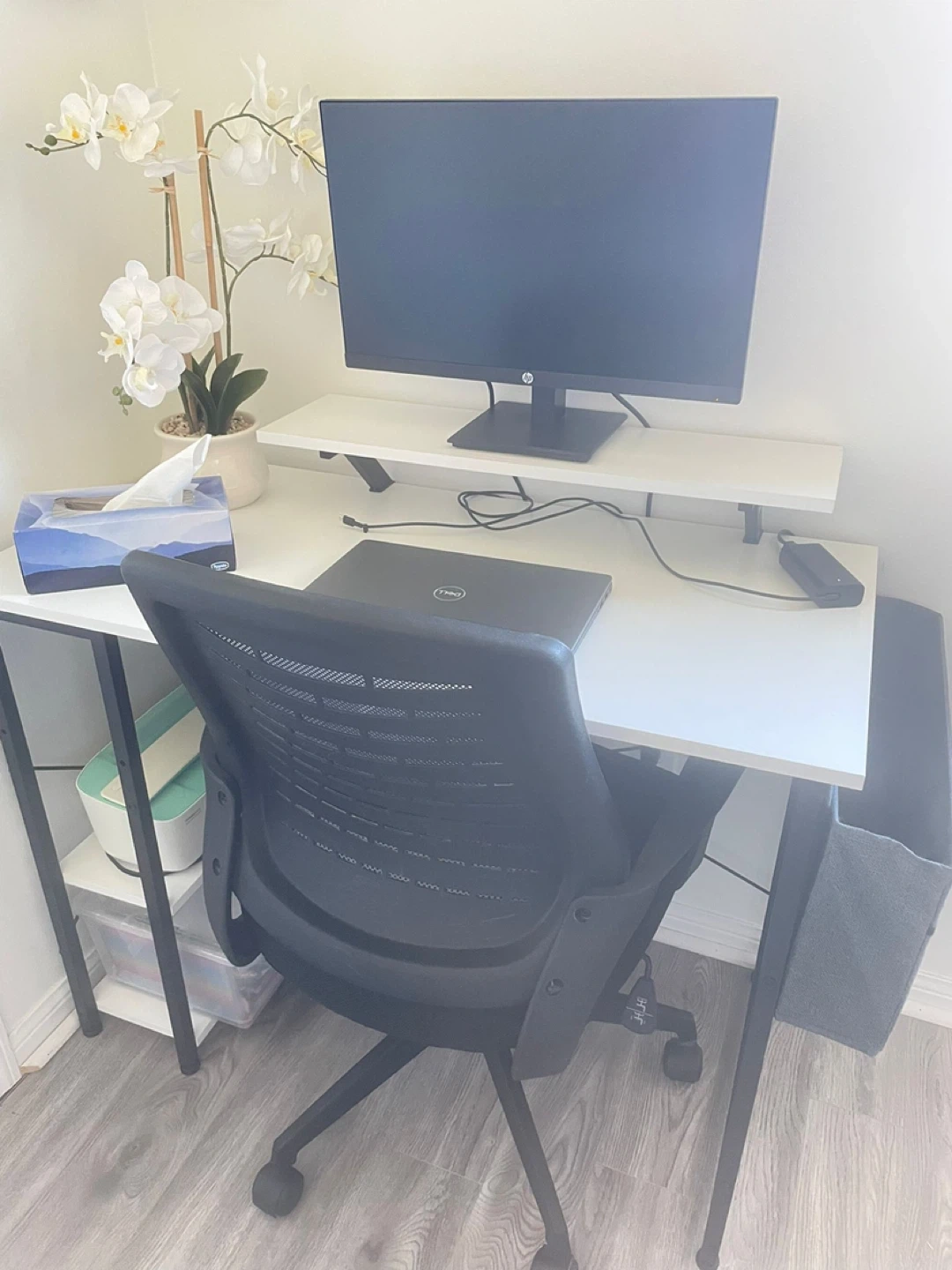 Selling a clean white desk that's perfect for a home office or study space! It features convenient shelves on one side and a storage pocket on the other, making it easy to keep your workspace organized. The desk is in great condition and ready for a new home