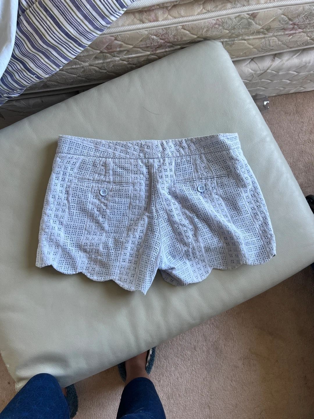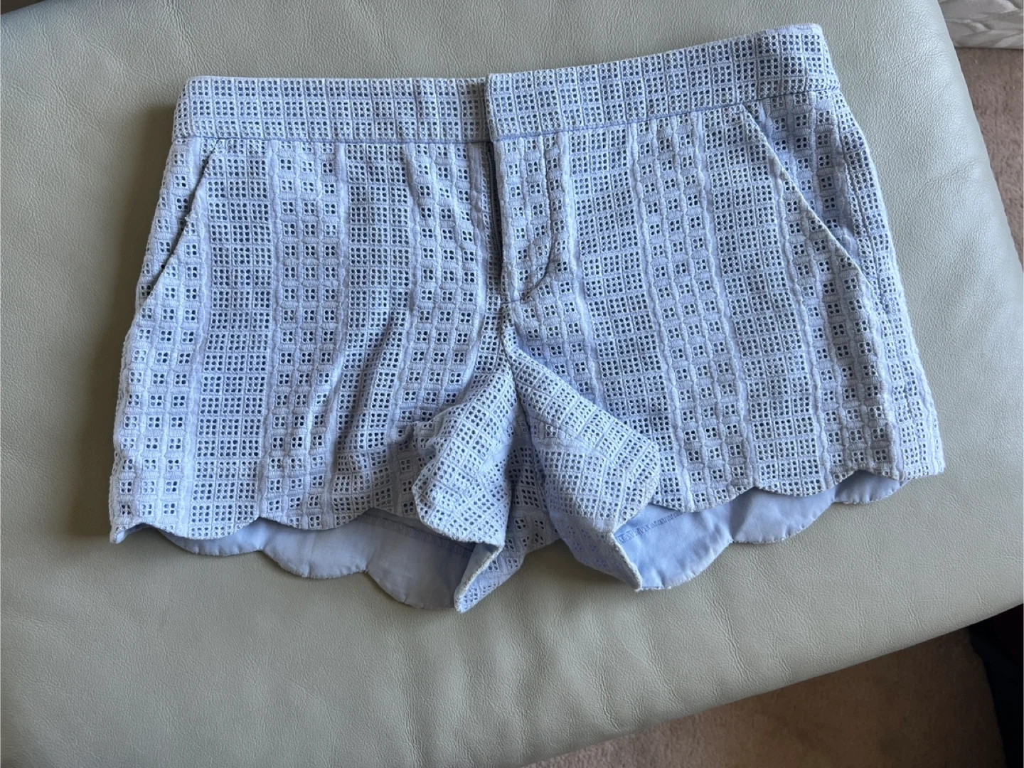 Eyelet and scalloped hem baby blue shorts from Club Monaco. Functional pockets. Size 2. But I also have a size 4 available.