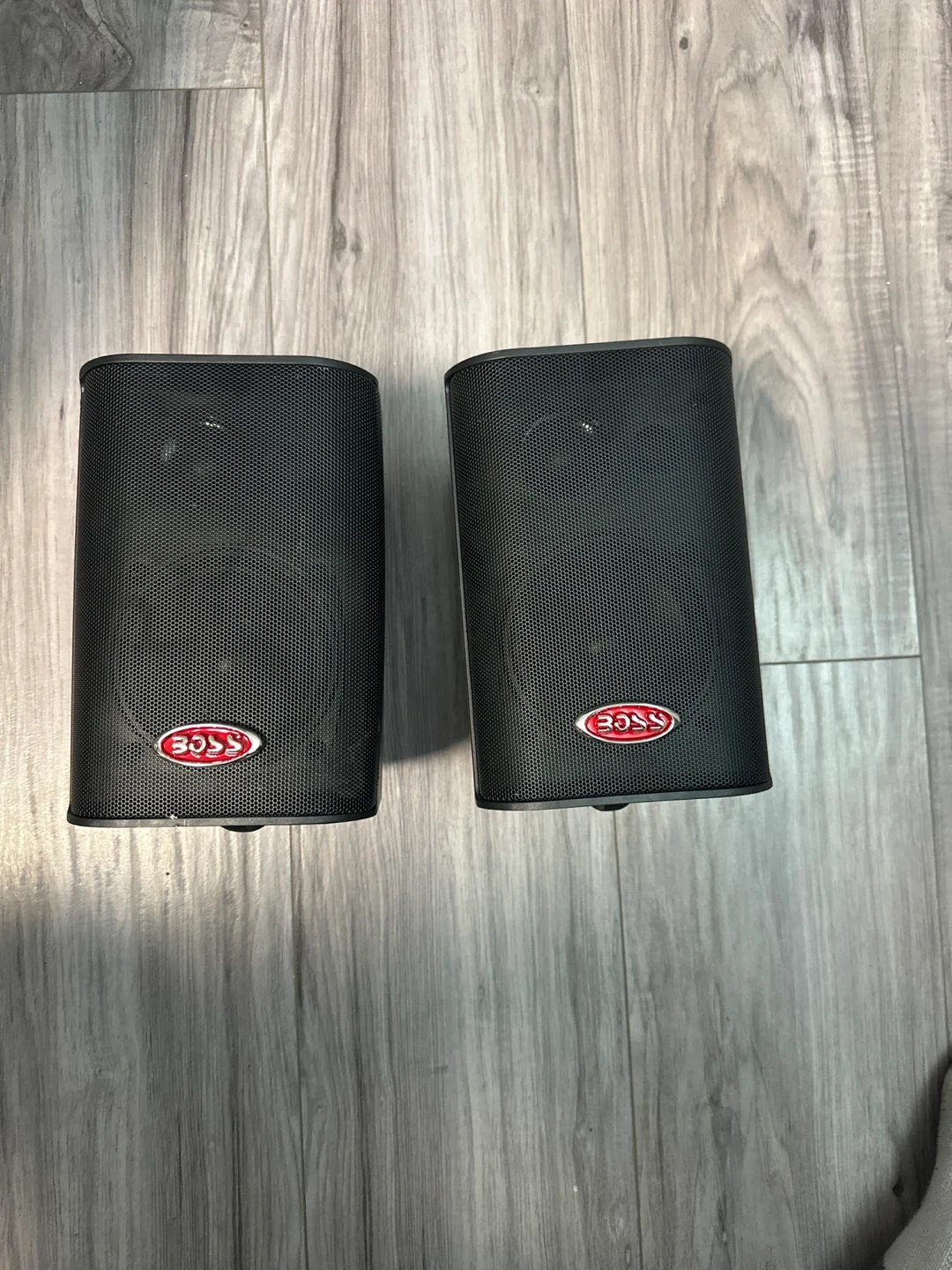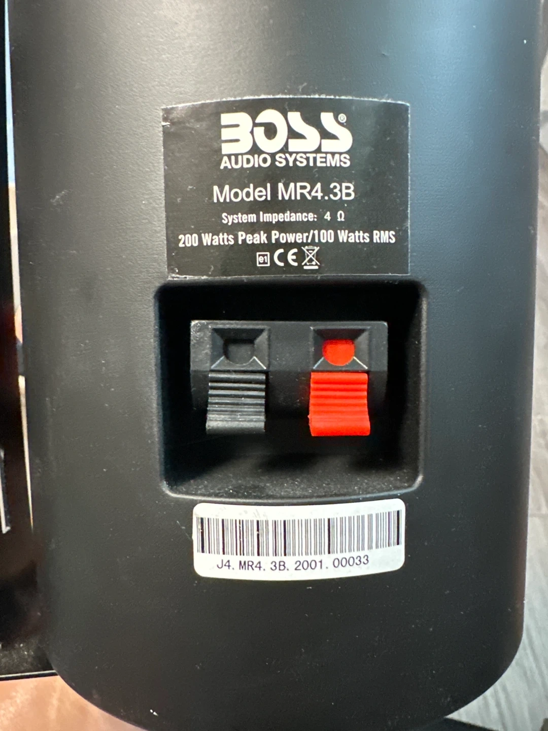 Selling a pair of BOSS Audio Systems speakers! The model is MR4.3B. These speakers have a system impedance of 4 Ohms and a power output of 200 Watts peak/100 Watts RMS. They're in great shape and ready to amplify your audio experience