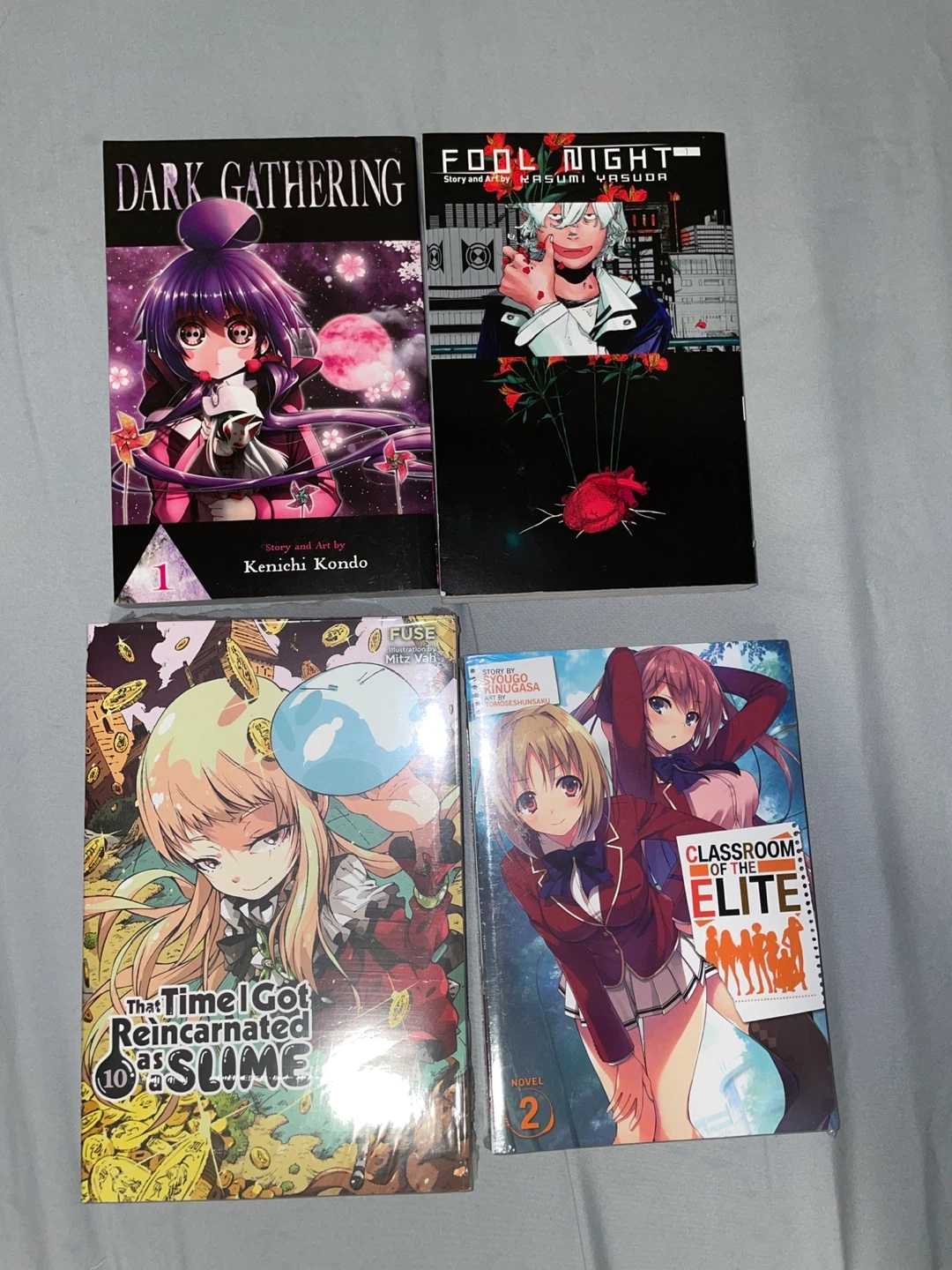 $5 each - Dark Gathering Vol 1 - Fool Night - That Time I Got Reincarnated as a Slime Vol 10 - Classroom of the Elite Novel Vol 2 - Berserk Vol 1, 2, and 3 Great for any manga enthusiast looking to expand their collection