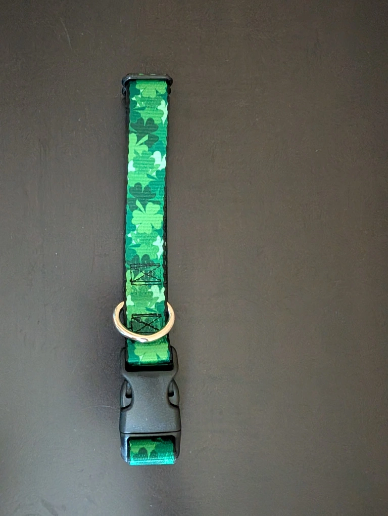 Keep your furry friend looking stylish with this Buckle-Down dog collar! It's a size large, designed to fit necks between 15 and 24 inches. The collar features a fun shamrock pattern in multiple colours. It is 1" wide.