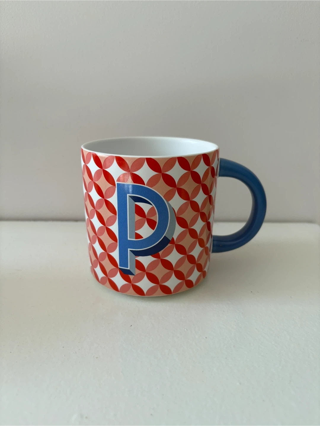 A cute Indigo mug featuring the letter P and a colourful geometric pattern! It's both dishwasher and microwave safe. Pick up in the Beaches at Queen and Victoria Park.