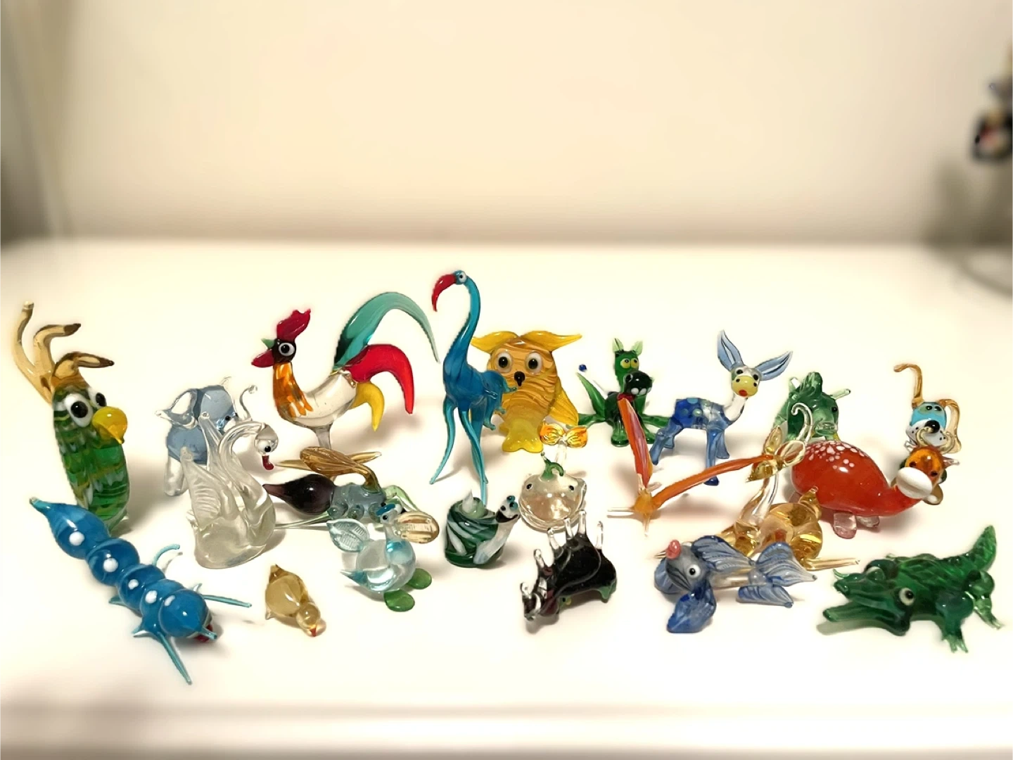 A collection of charming glass animal figurines. These 21 delicate pieces would make a lovely addition to any collection or a whimsical touch to your decor. Each figurine is beautifully crafted, sizes are between 1-3.5” long.