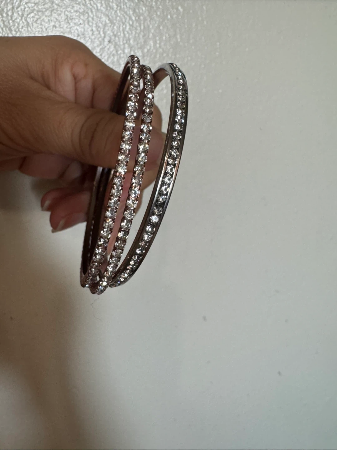 Selling a set of three rhinestone bangle bracelets. They are in great condition and feature a mix of silver and rose gold tones. Perfect for adding a bit of sparkle to any outfit! Cash Pick up near Lawrence and Keele