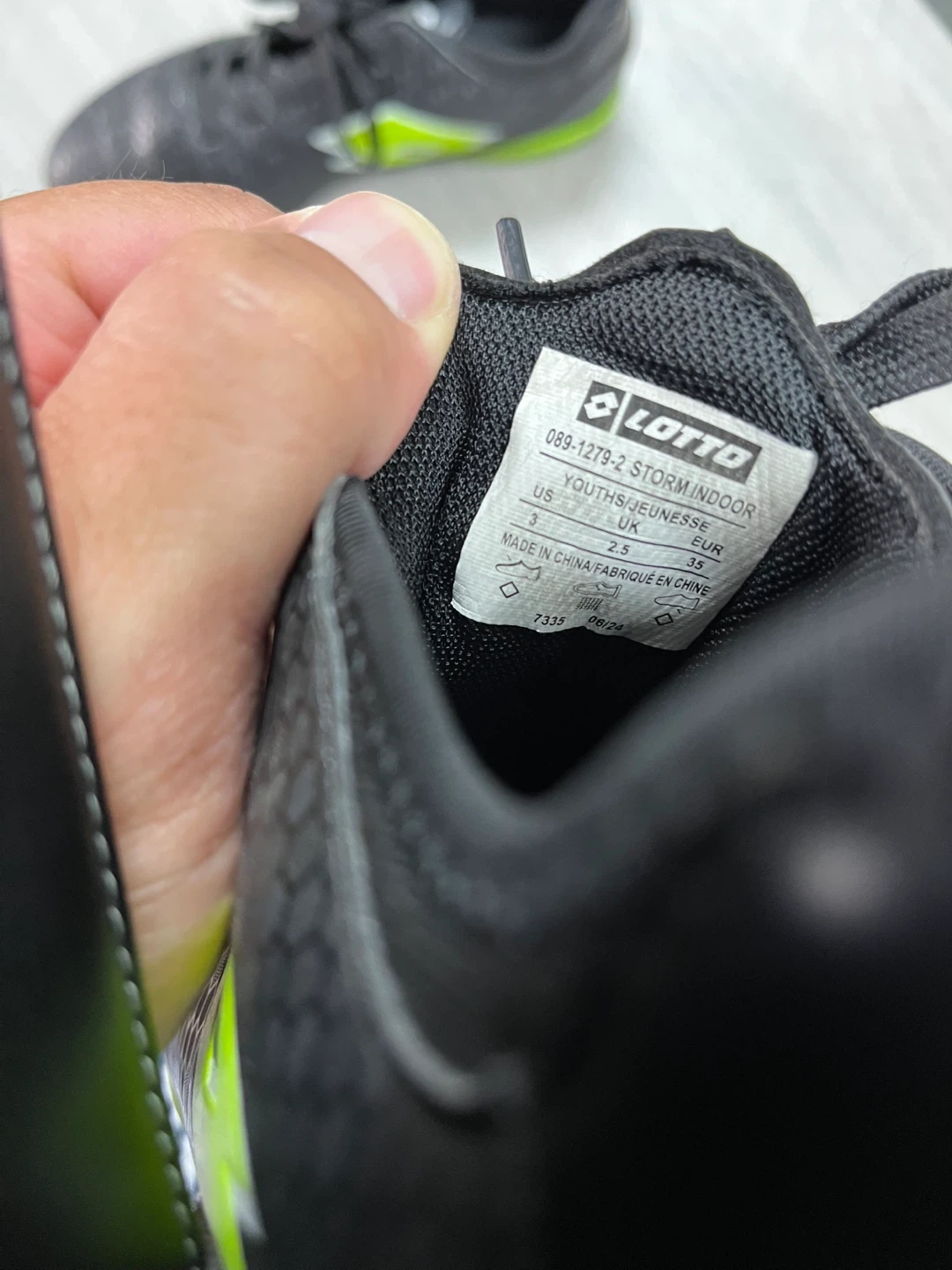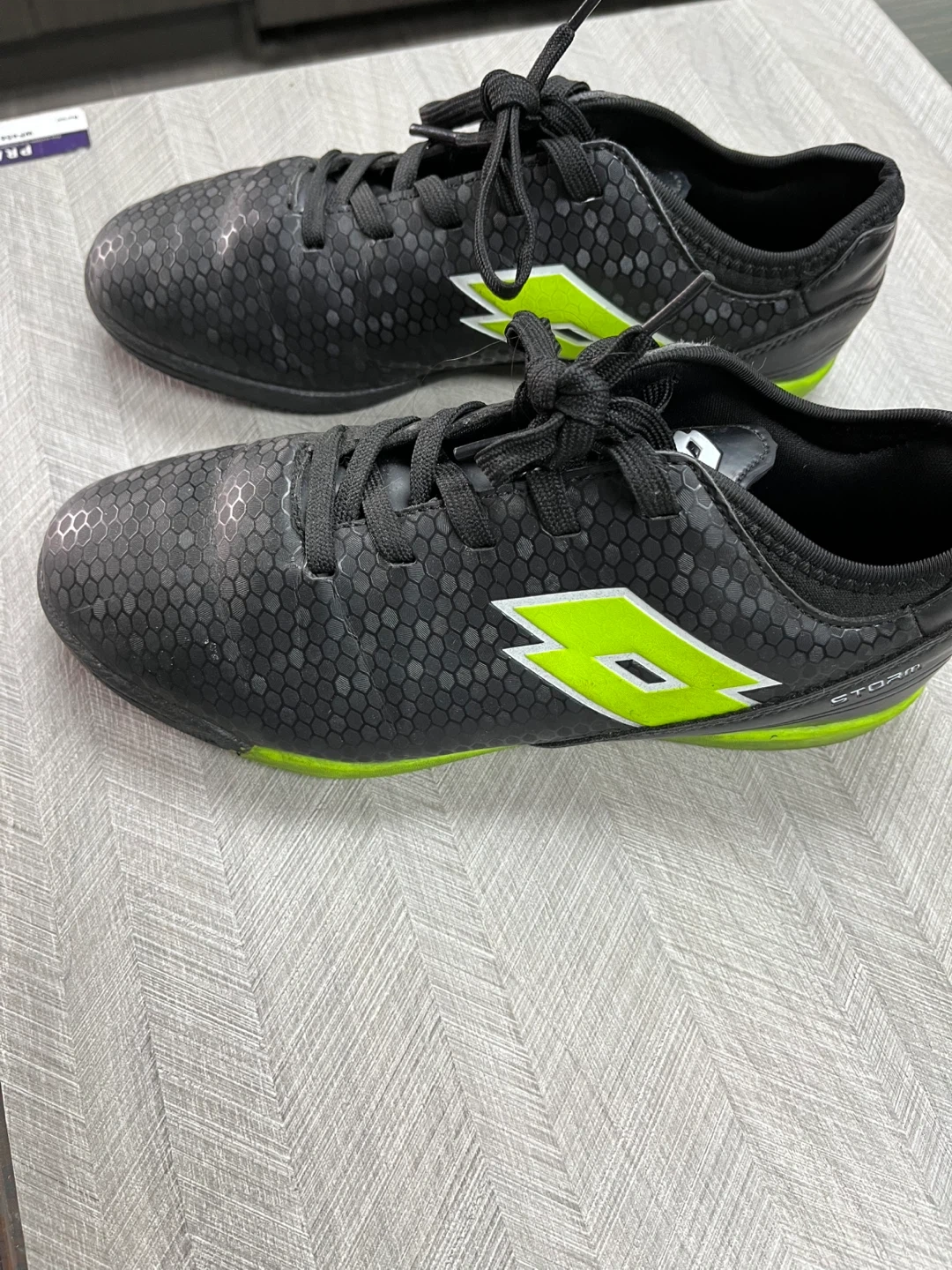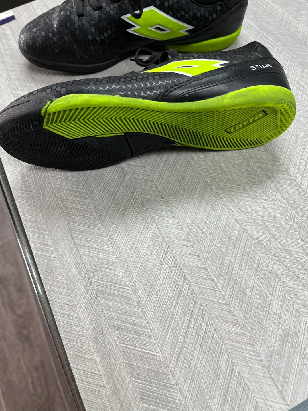Selling a pair of Lotto Storm Indoor soccer shoes. They're a youth size 3 and in good condition for indoor play. The shoes are black with a vibrant green accent. Perfect for your little soccer star!