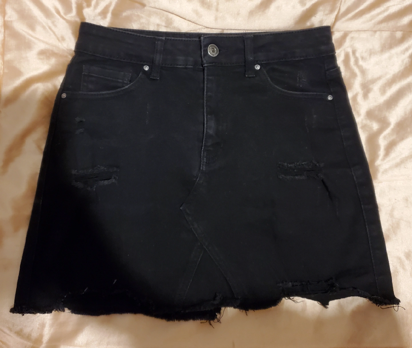 Wax jean black denim mini skirt with frayed edges and distressed denim. Size small (s/p) Measurements in photos. Good condition.