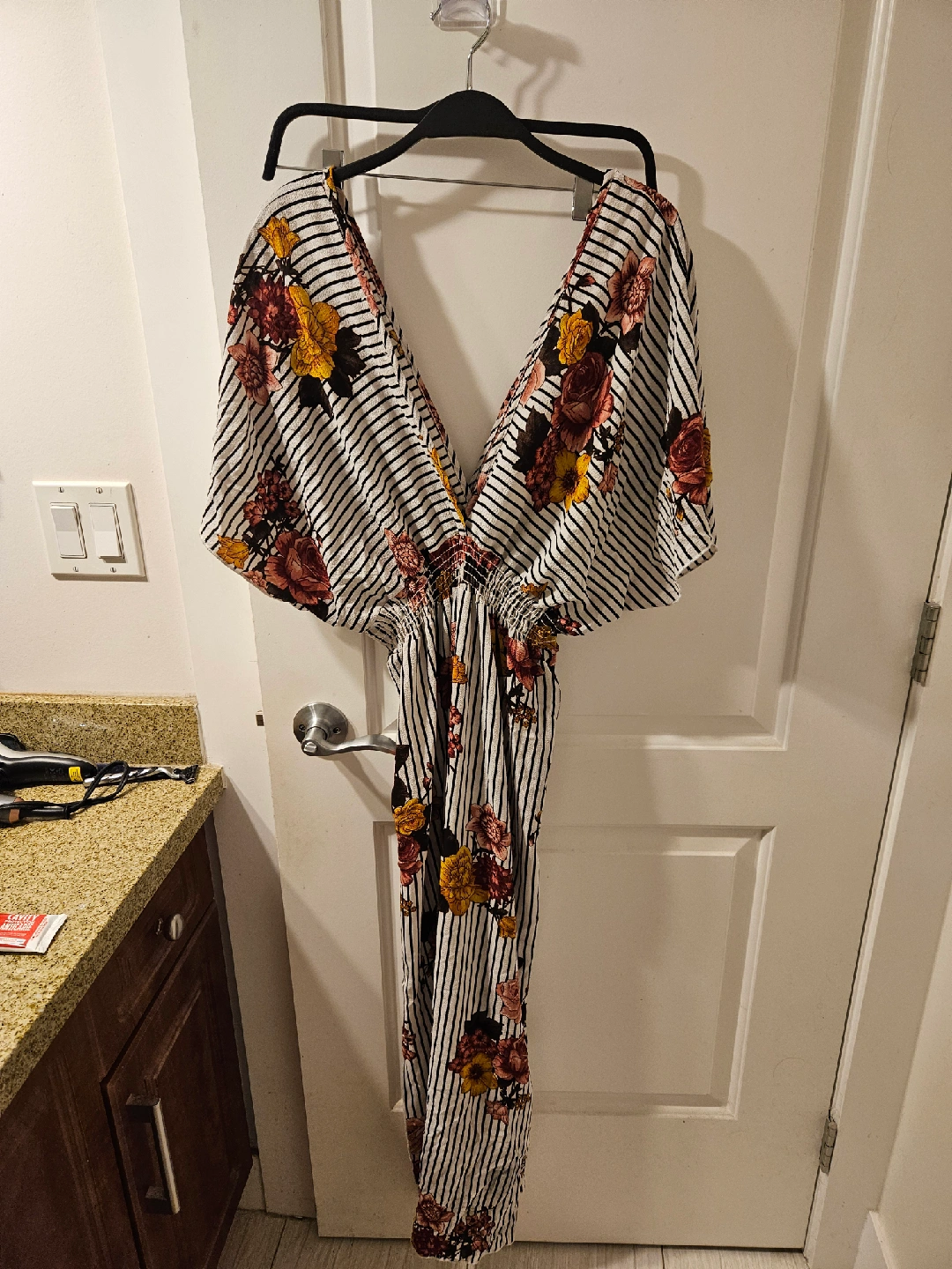 Beautiful floral striped maxi dress in great condition! Perfect for summer days or evenings out. The dress features a flattering V-neck and a comfortable, flowy fit. It's made of a lightweight material that's perfect for staying cool and stylish.