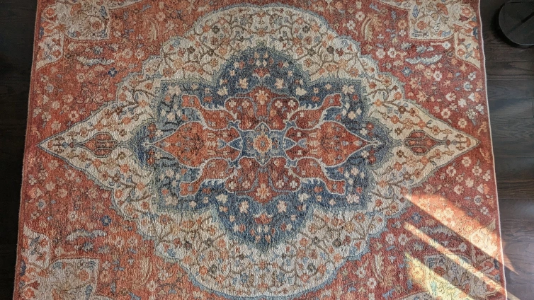Here's a beautiful area rug featuring a blend of red, blue, and beige tones. It would look great in any room! (80"x60")