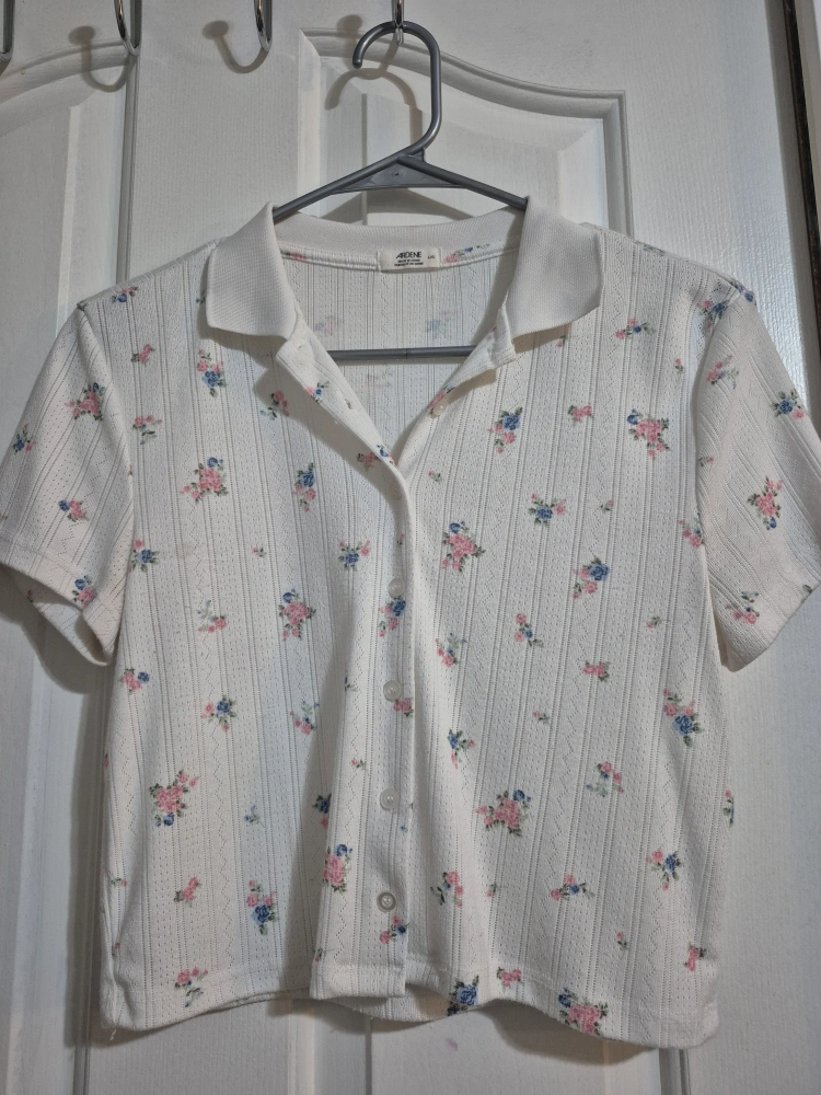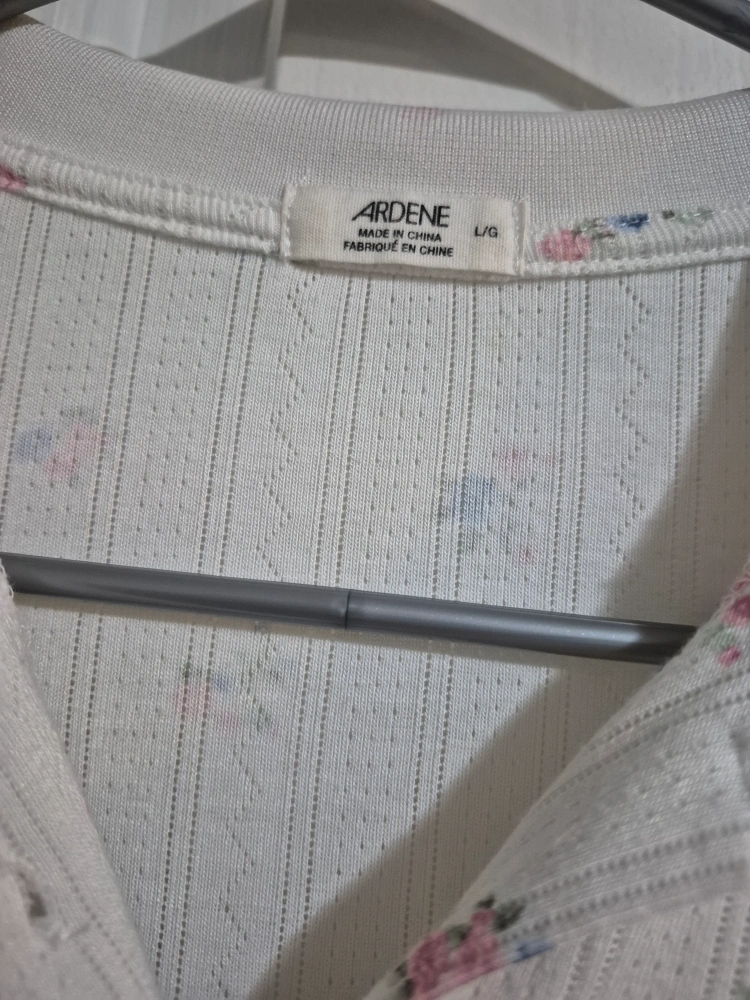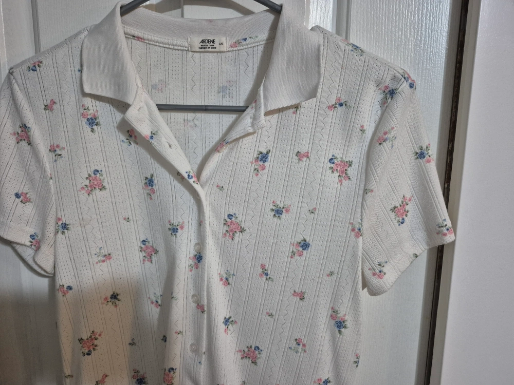 Here's a cute Ardene polo shirt with a floral pattern! It's a size large and perfect for a casual, breezy look. The material is lightweight and comfortable, great for warmer weather. It's in excellent condition and ready for a new home. doesn't fit me now so selling it.
