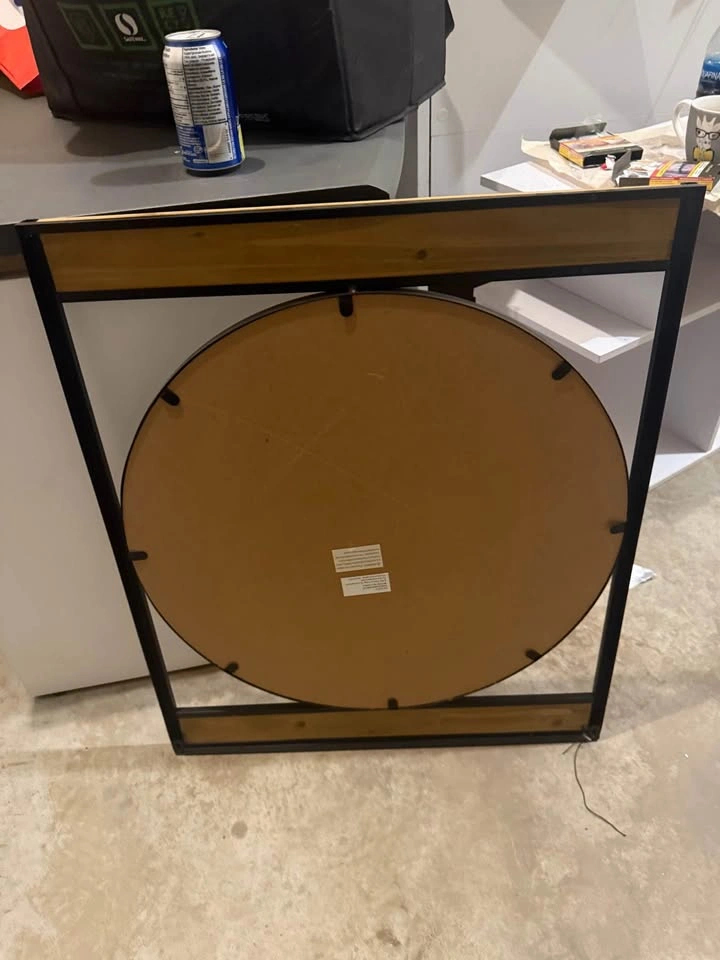 Add a touch of modern industrial style to your space with this unique round mirror. Featuring a sleek black metal frame, warm wood accents on the top and bottom, and a clean geometric design, this piece blends rustic charm with contemporary elegance. Perfect for entryways, living rooms, bedrooms, or as a statement piece in your office. • Sturdy black metal frame with natural wood inserts • Large round mirror set inside a rectangular frame • Versatile design works with modern, farmhouse, or industrial décor • Ready to hang (hardware not included) • Dimensions (approx.): 30” H x 24” W (mirror diameter ~20”) Condition: Excellent condition, no cracks or chips.