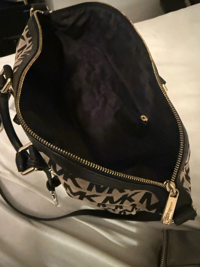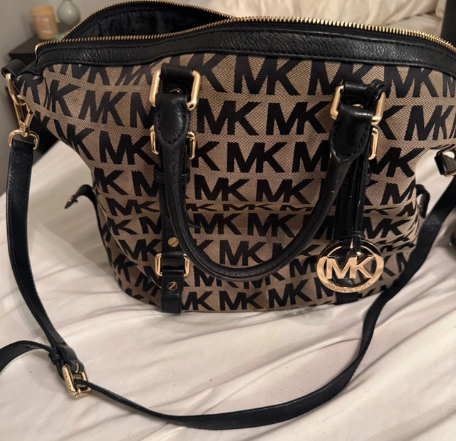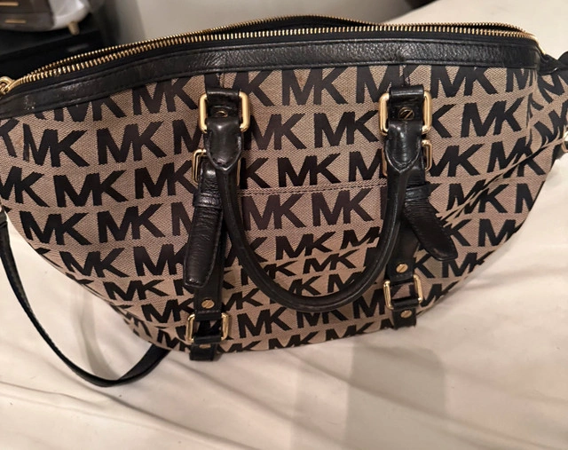 This is a stylish, used Michael Kors satchel with the iconic MK logo pattern, perfect for everyday use. It features a spacious interior, sturdy handles, and a detachable shoulder strap. The bag shows some signs of wear, but is overall in good condition. Features: - Brand: Michael Kors - Style: Satchel - Material: High-quality canvas with leather trim - Colour: Beige and brown with black accents - Hardware: Gold-tone - Closure: Zipper - Interior Pockets: One zip pocket, four slip pockets - Exterior: MK logo print - Dimensions: 13" (L) x 9" (H) x 5" (D)