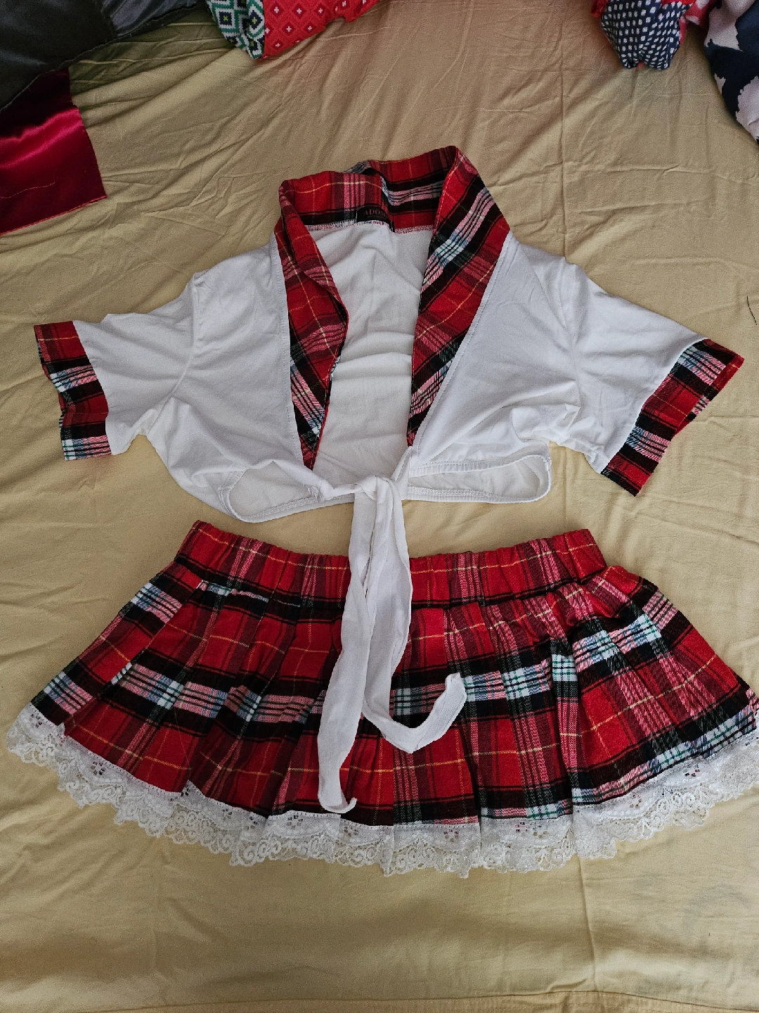 Cute Avidlove schoolgirl lingerie set! The set includes a white tie-front top with red plaid trim and a matching red plaid skirt with lace trim. Perfect for adding a little fun to your wardrobe