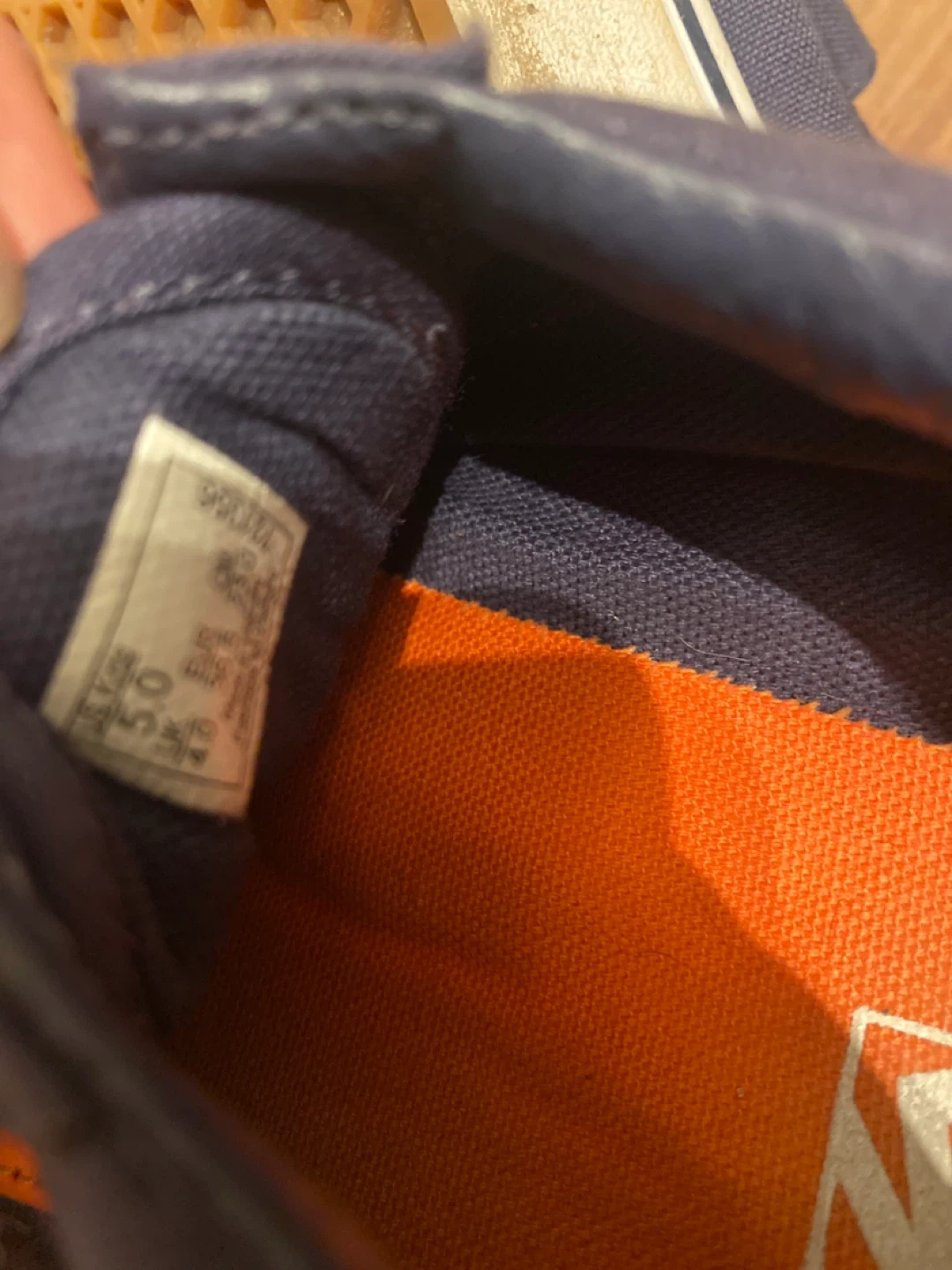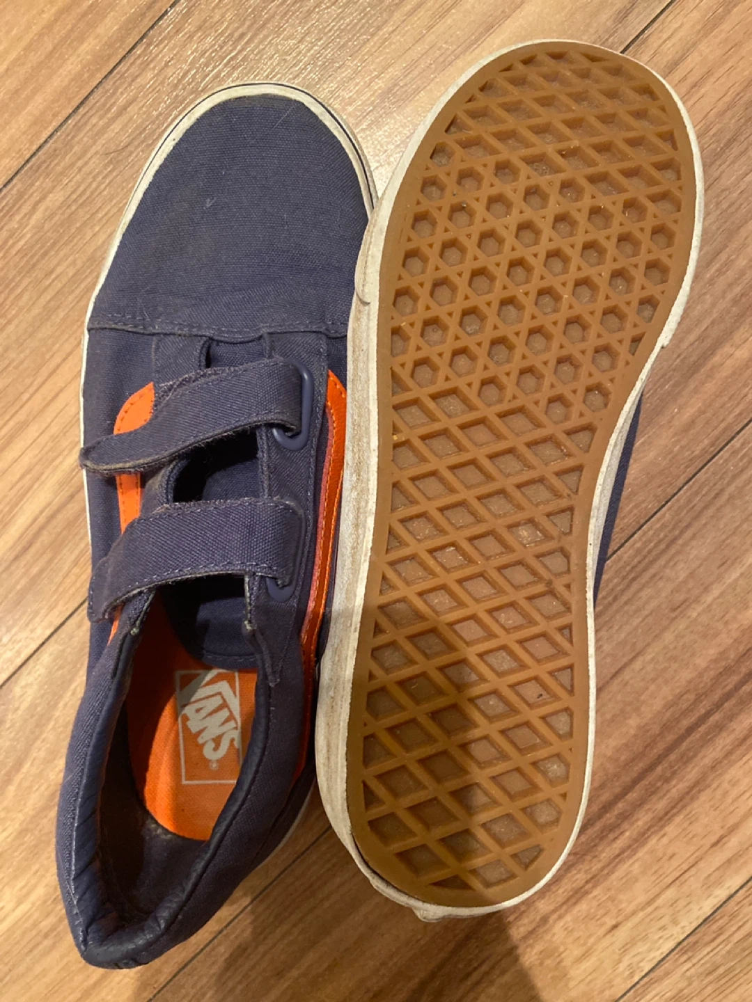 Selling a pair of Vans kids' shoes in size 5. They're in good condition and have a cool navy blue and orange colour scheme. Perfect for everyday wear!