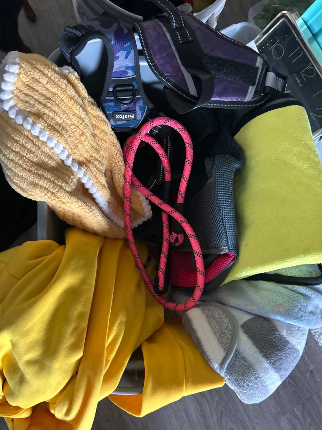 Bin full of harnesses, clothing (small) thick lead, towels and carriers. Sell as a unit.$20