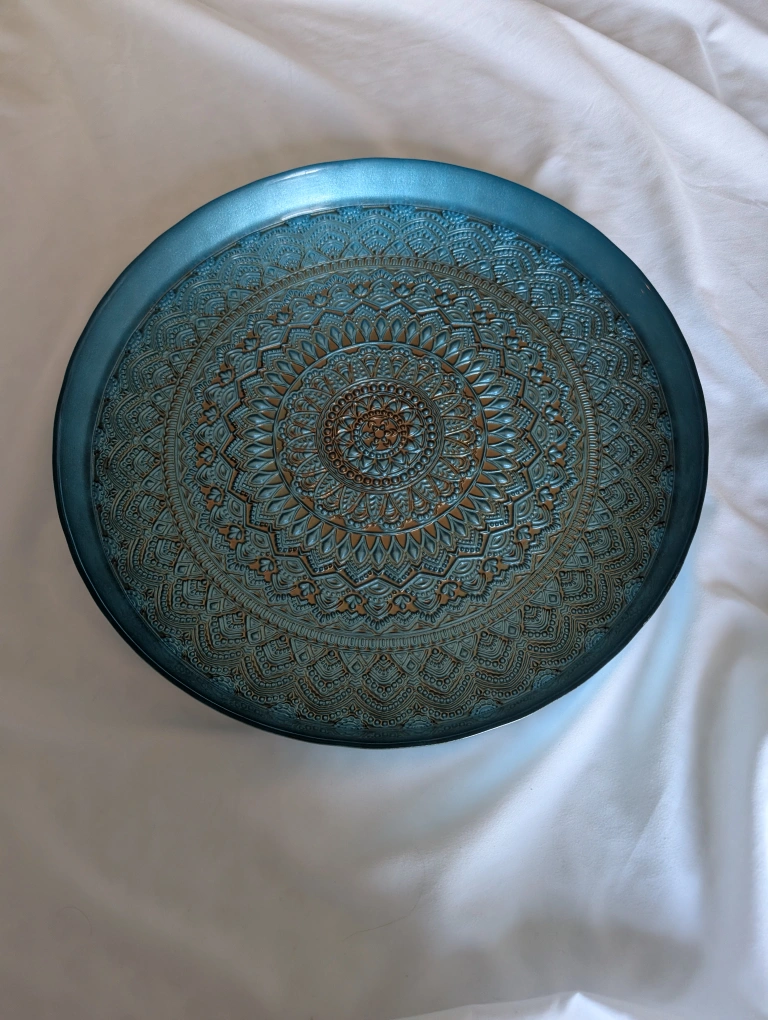Selling a beautiful decorative tray with a mandala pattern. It's a lovely shade of blue and would look great as a centrepiece or for serving snacks