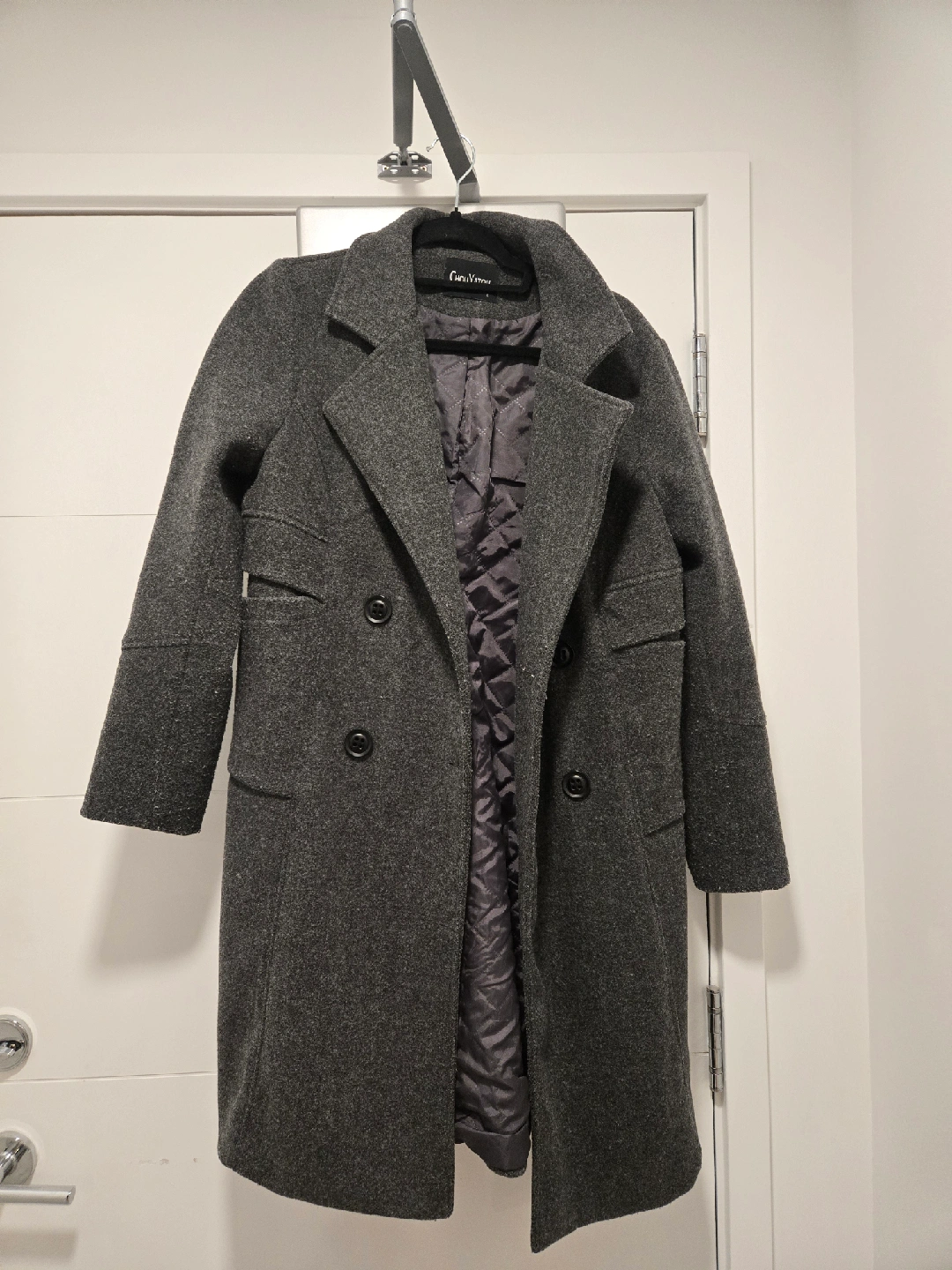 Selling a Chouyatou wool blend coat in grey, size large. It's a stylish and warm coat, perfect for the cooler weather. The coat is in great condition and ready for a new home!