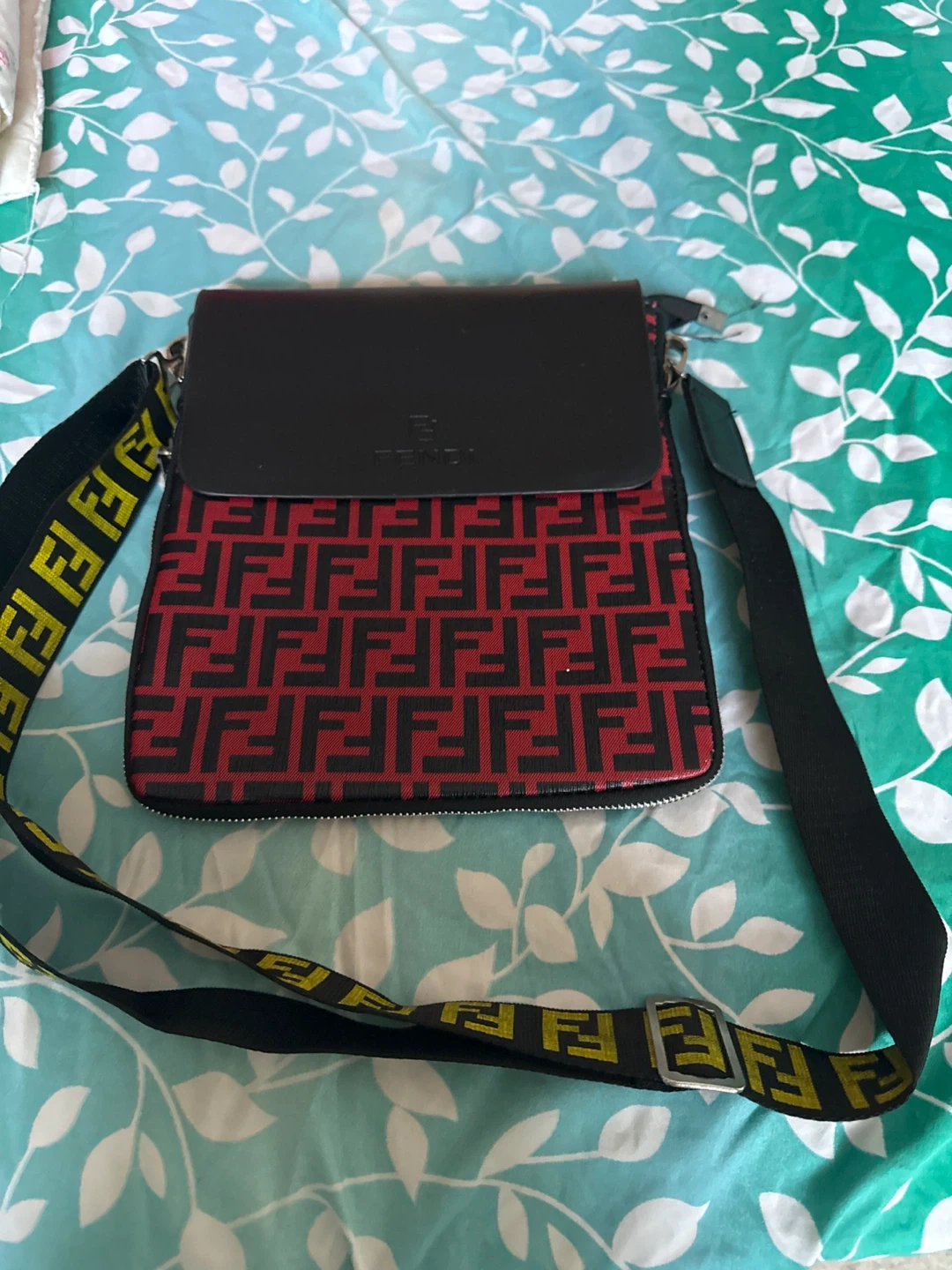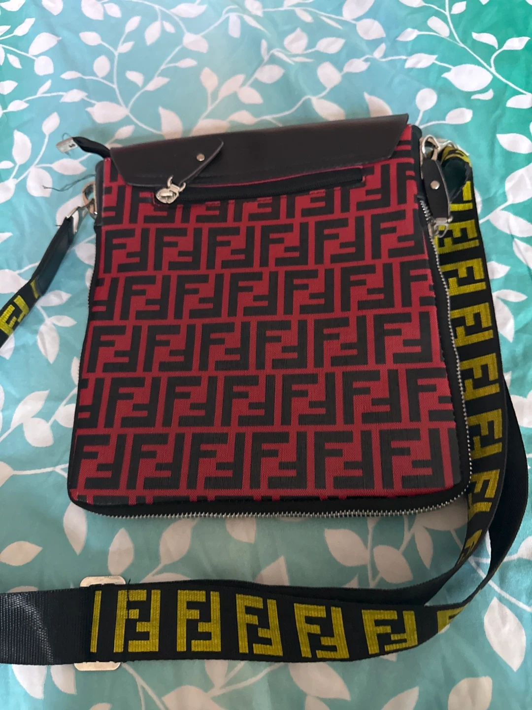 Stylish Fendi crossbody bag featuring the iconic Fendi logo pattern in red and black. The bag has a black leather flap and a black and yellow strap. Perfect for adding a touch of luxury to your everyday look!