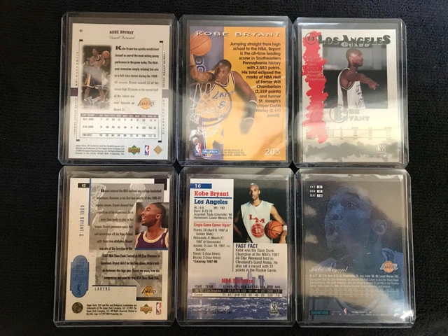 I'm offering a set of 6 Kobe Bryant NBA cards. These cards feature various images of Kobe in action, celebrating his career with the Los Angeles Lakers. They are in excellent condition and would be a great addition to any basketball memorabilia collection.