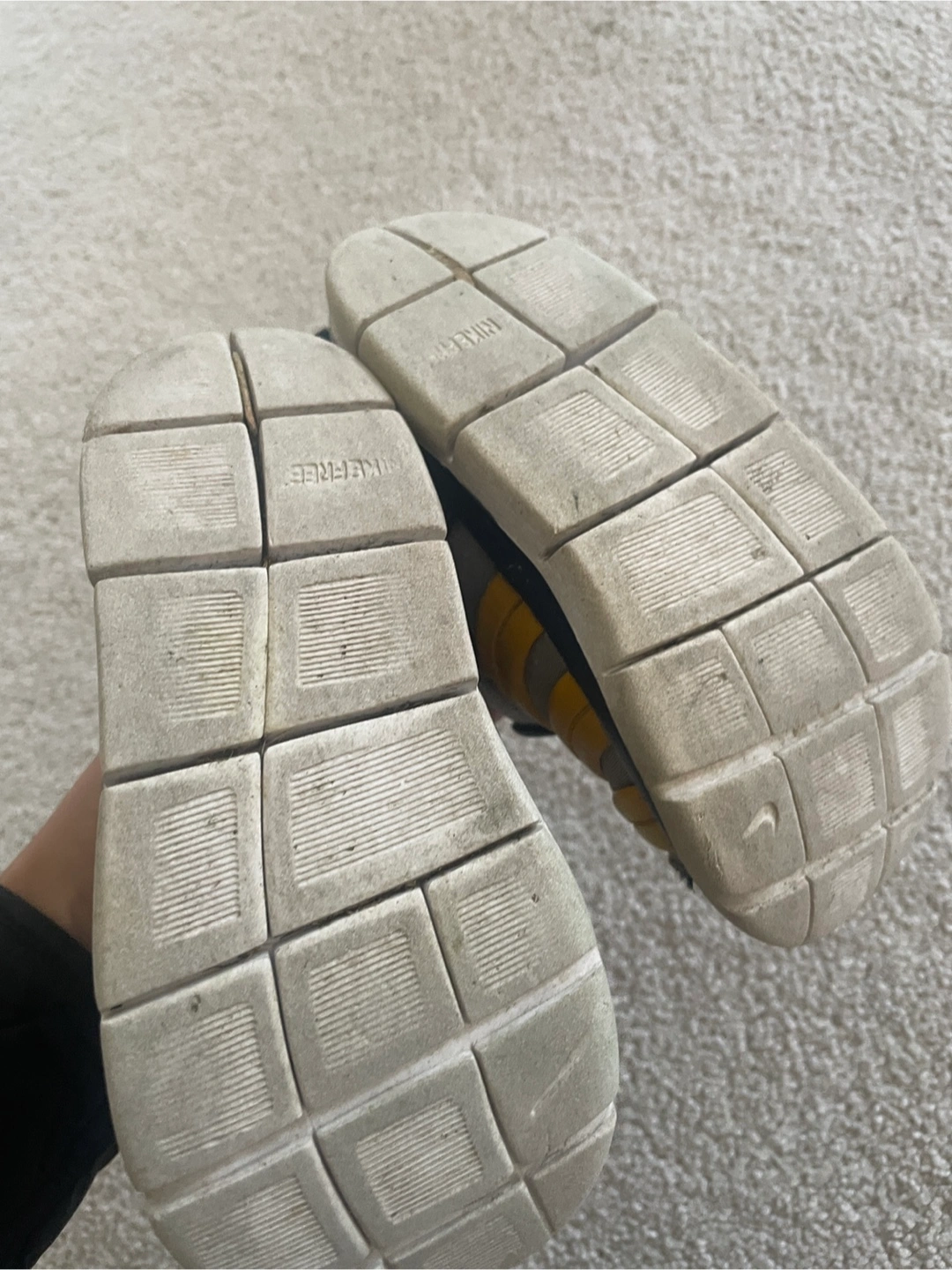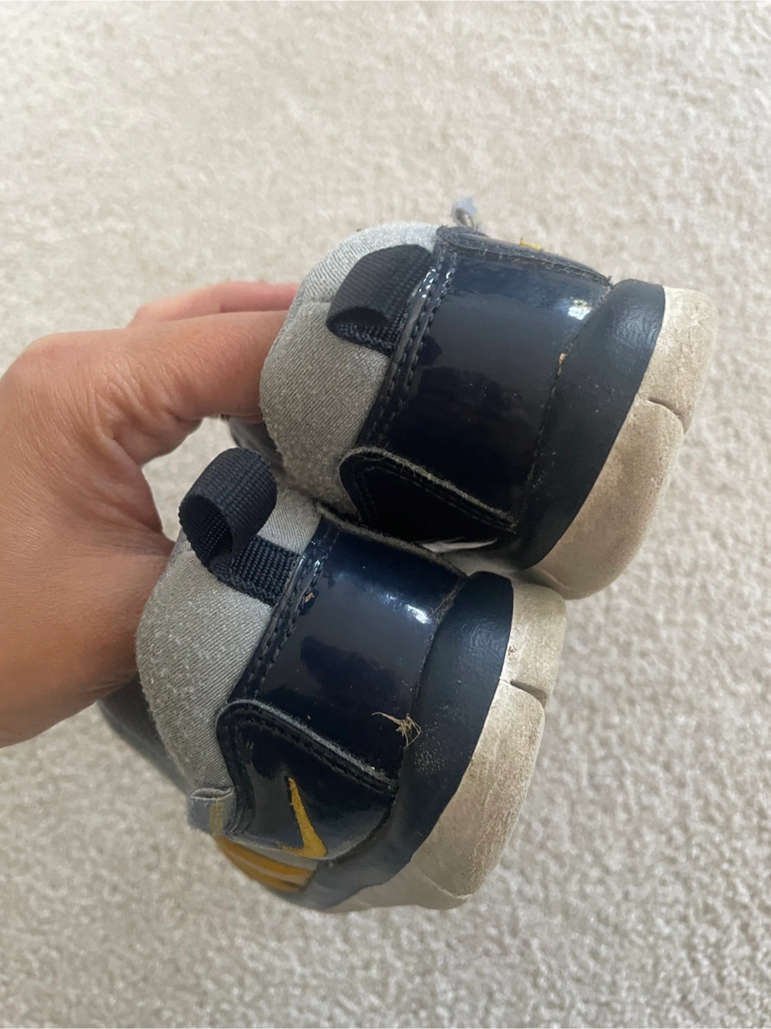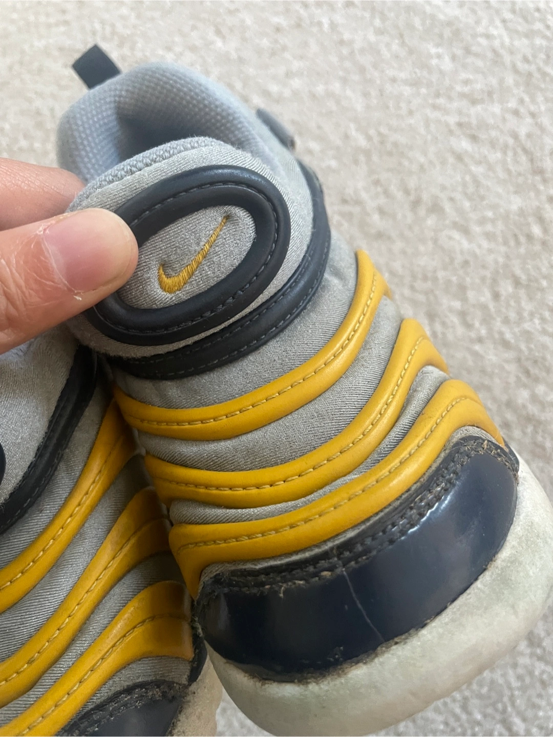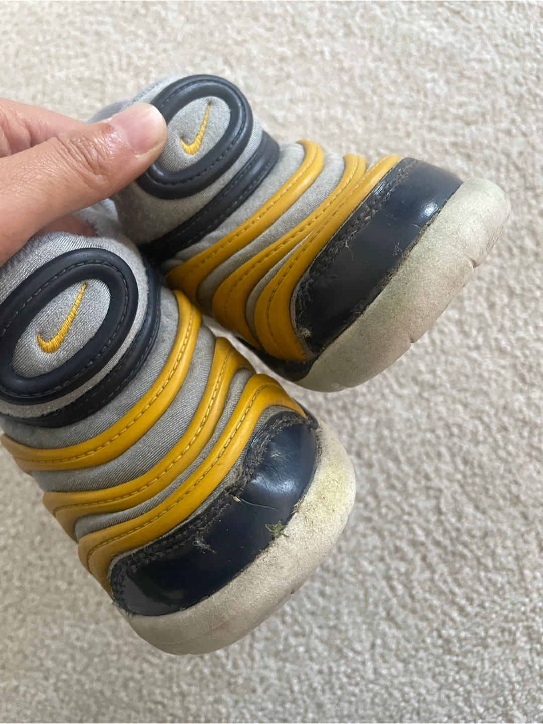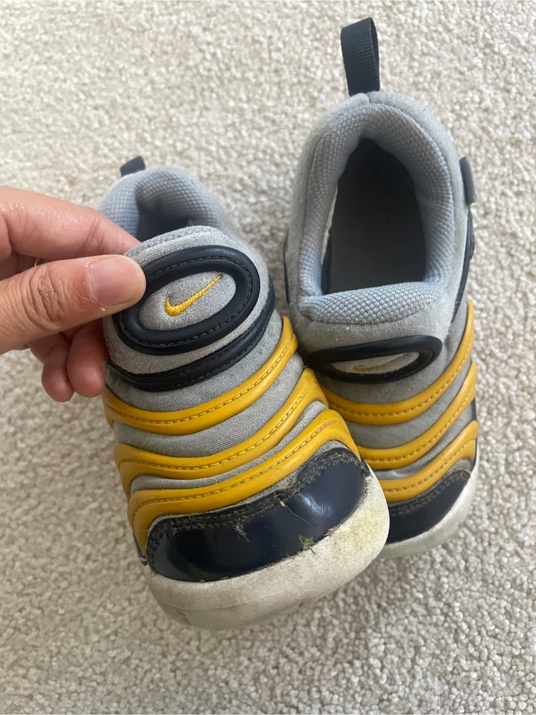 Selling a pair of Nike Dynamo Go toddler shoes in size 10C. They are grey with yellow accents and show some signs of wear, but still have lots of life left in them! Great for your little one to run around in