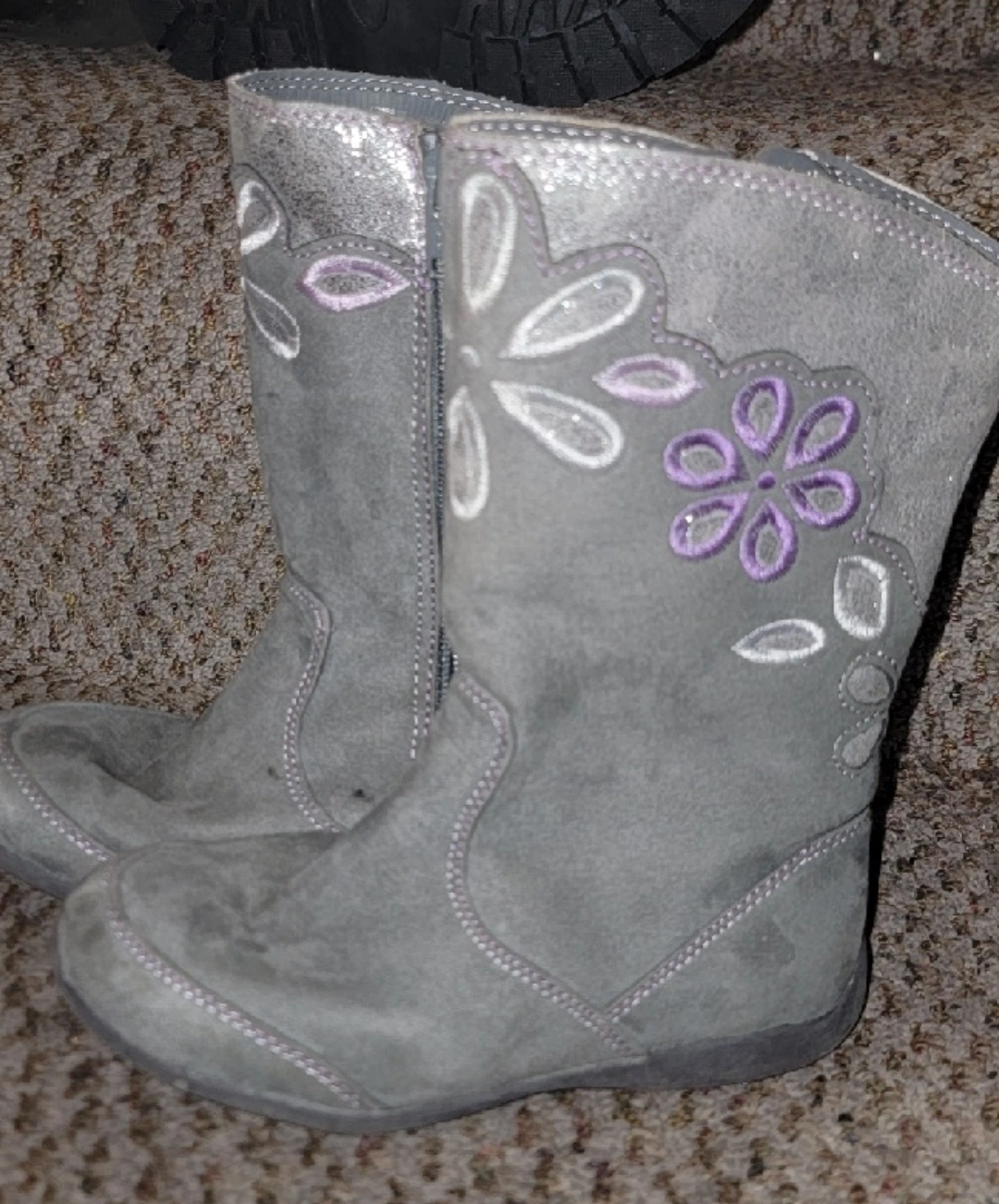 Cute gray boots for a toddler! These are size 8 and feature a floral design. They are in good used condition and ready for a new home