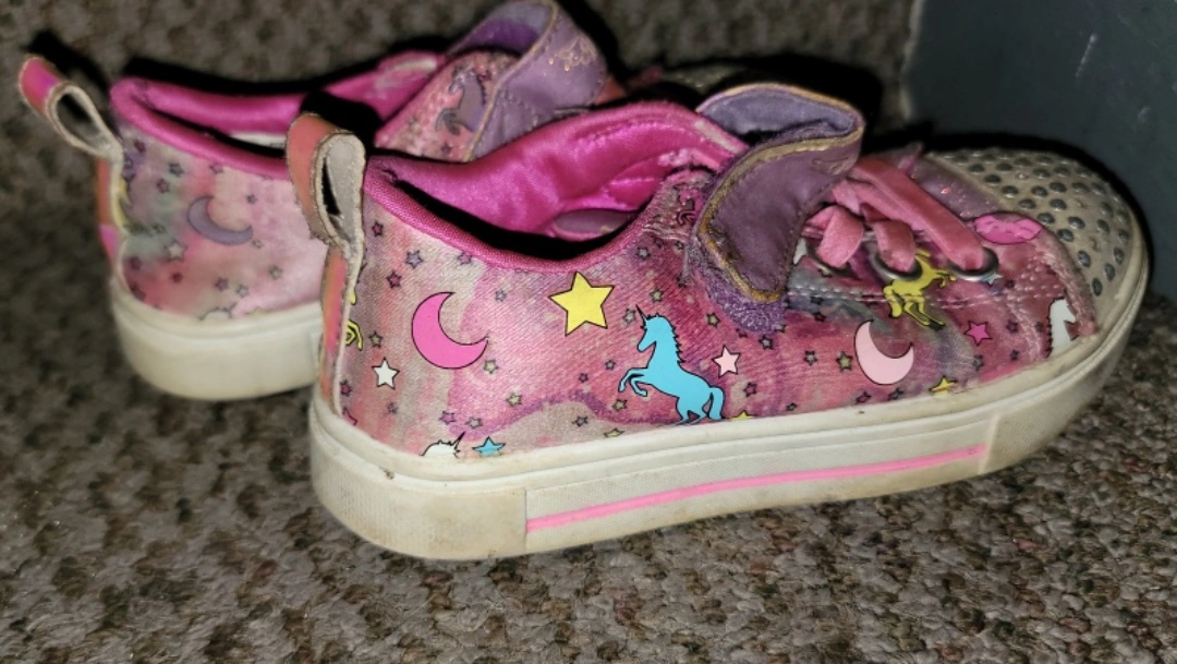 Cute Skechers Twinkle Toes sneakers in a size 10! They feature a fun unicorn and star pattern with pink and purple accents. Perfect for your little one!