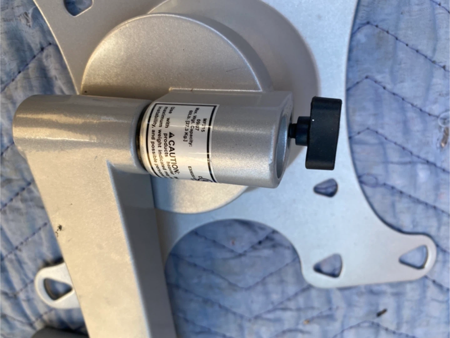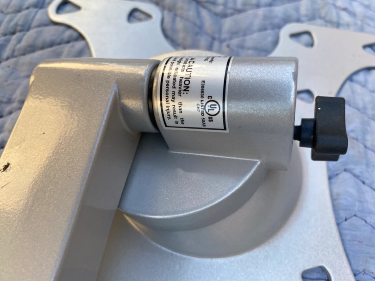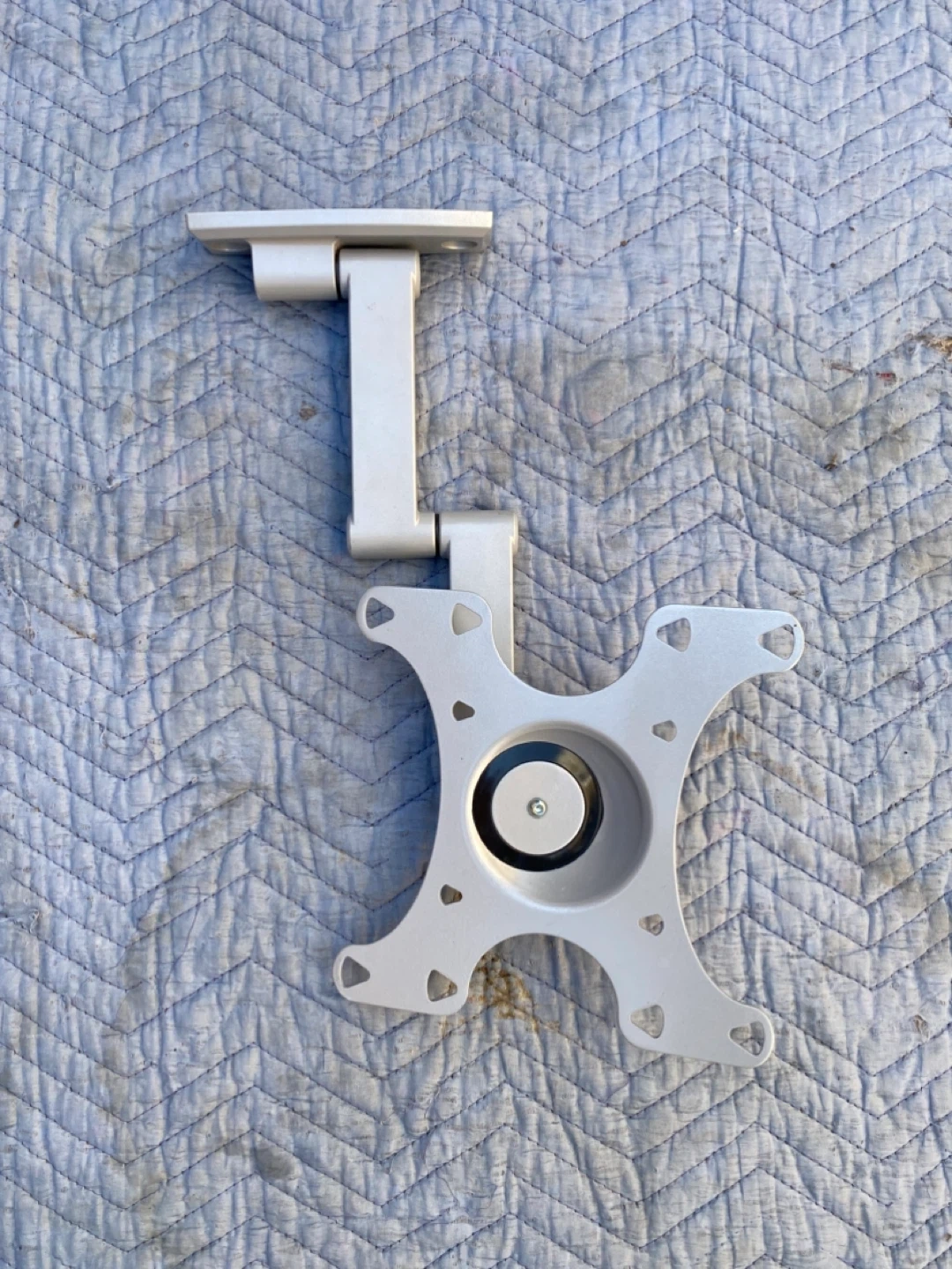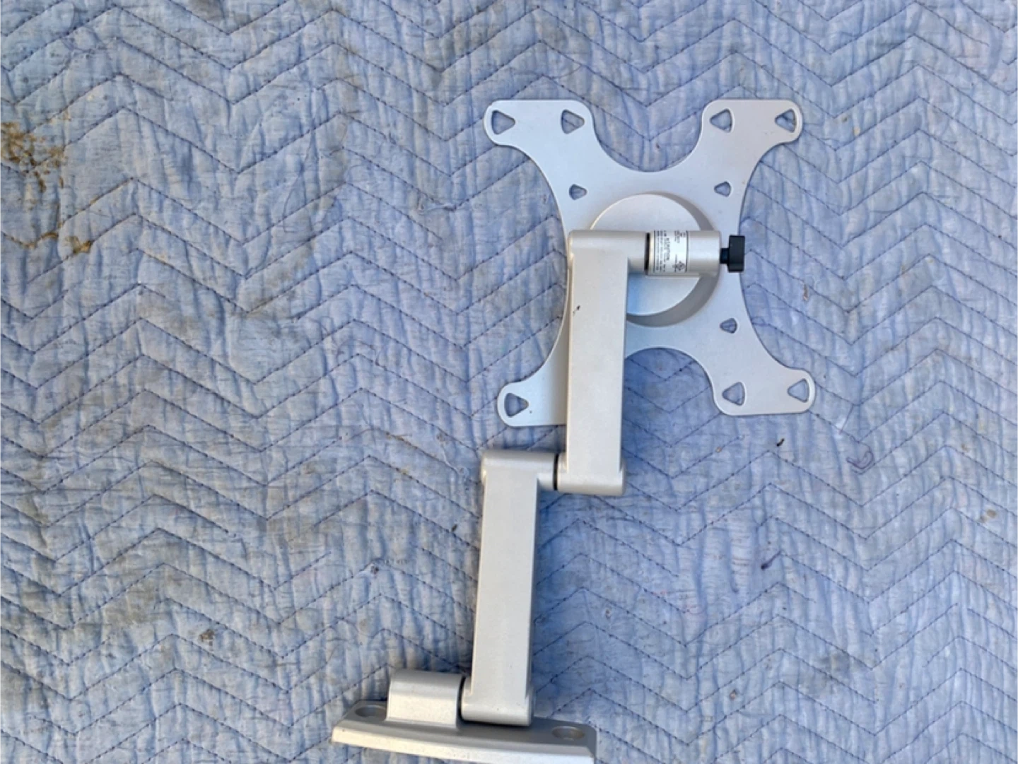 Selling a used silver articulating monitor mount. It's in good condition and ready to hold your monitor securely. It has an adjustable arm for optimal viewing angles. No screws or bolts, easy to buy at Home Depot.
