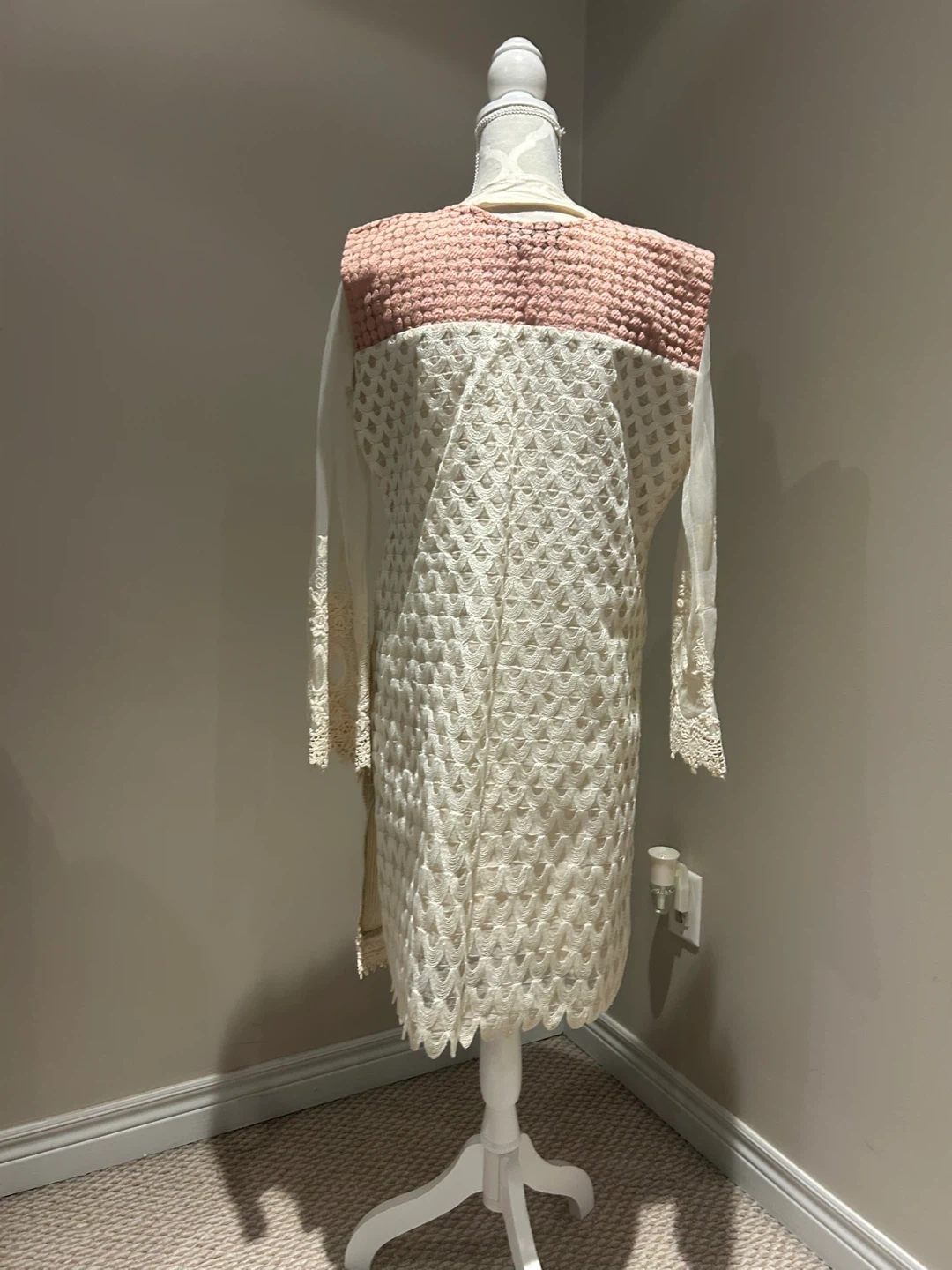 Beautiful cream-coloured 4piece Pakistani suit with delicate embroidery and lace detailing. The outfit includes a shirt, pants, and a yellow dupatta. It's in great condition and perfect for a special occasion!