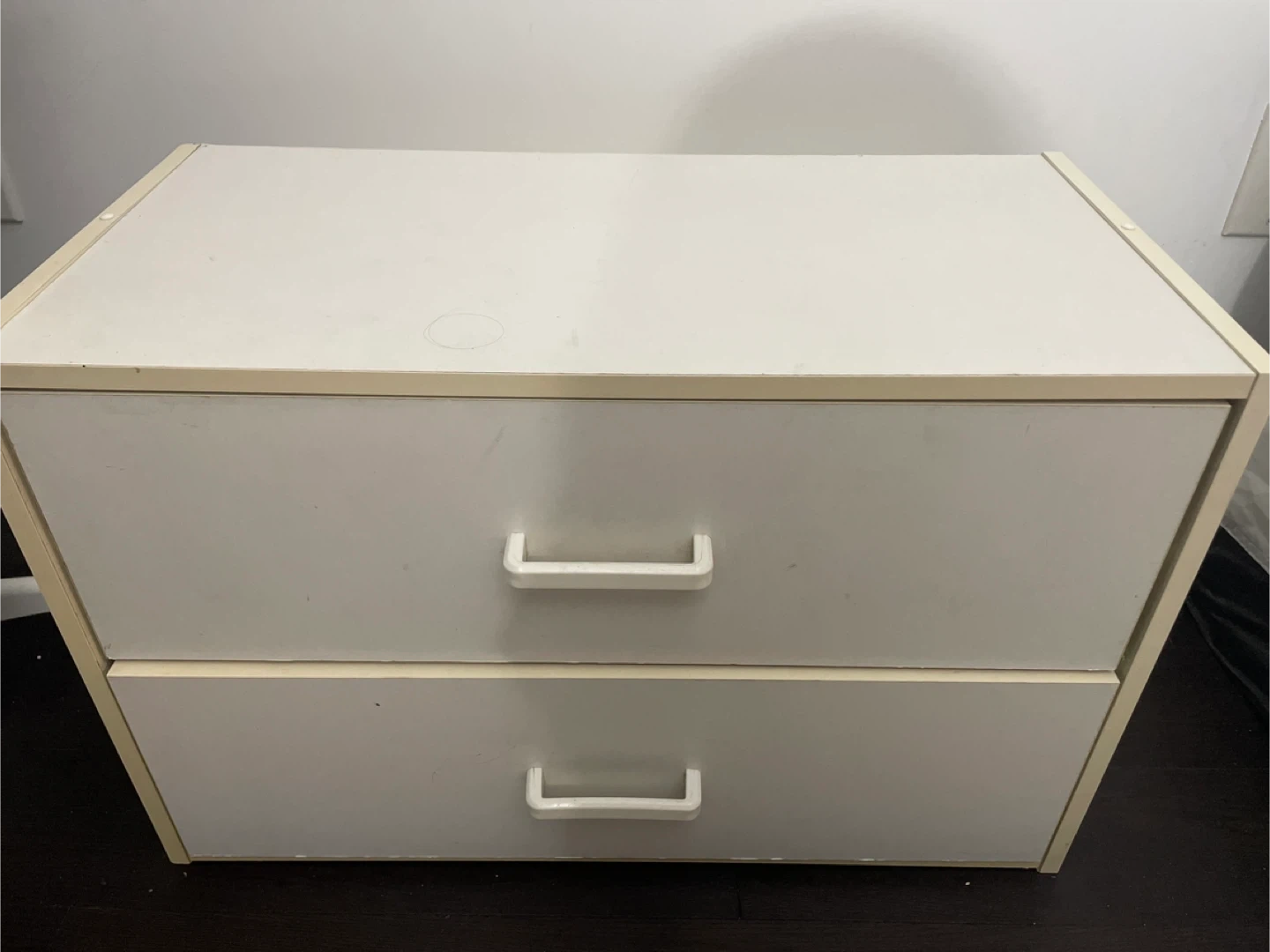 White 2-Drawer Dresser ****unfortunately the handle is broken and needs an easy fix Selling a simple white dresser with two drawers. It's perfect for adding some extra storage to a bedroom or closet. It has a clean, minimalist look that would fit well in any space! There are some minor signs of use, as shown in the pictures