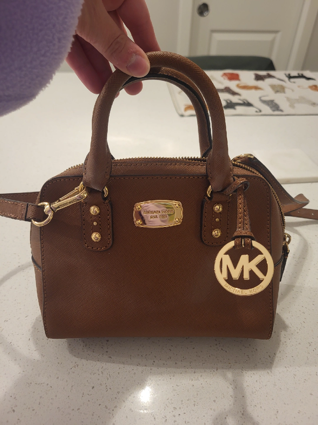 Selling a cute Michael Kors satchel bag in brown! It's in great condition and perfect for everyday use. The bag features the classic MK logo charm and has a convenient shoulder strap that can be detached if needed. Inside, you'll find the signature Michael Kors lining.