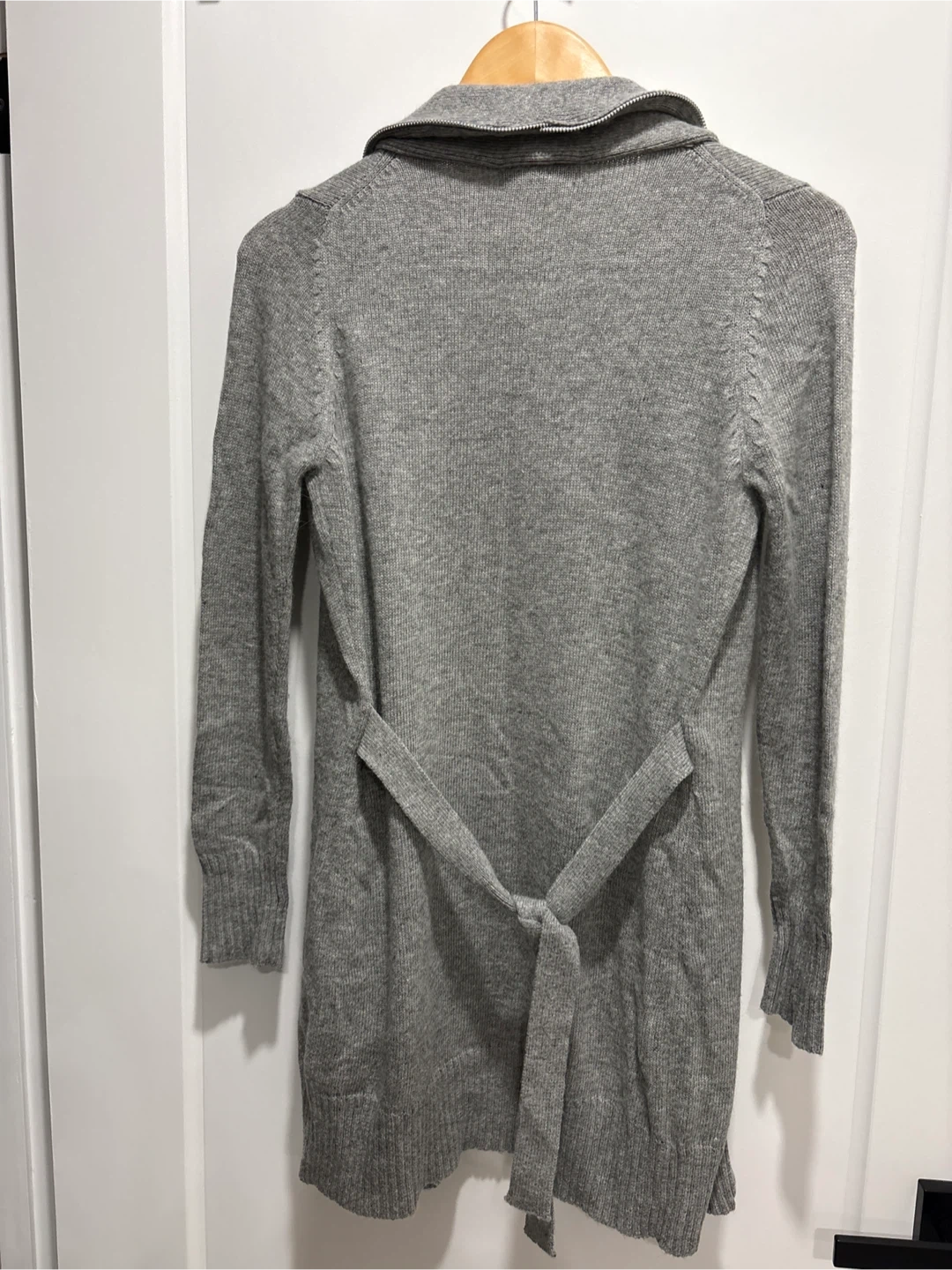 Selling a BCBGMAXAZRIA cardigan in size small. It's a lovely grey colour and made of a soft blend of 15% angora, 30% wool, 55% nylon. Perfect for layering! Brand New L 30”