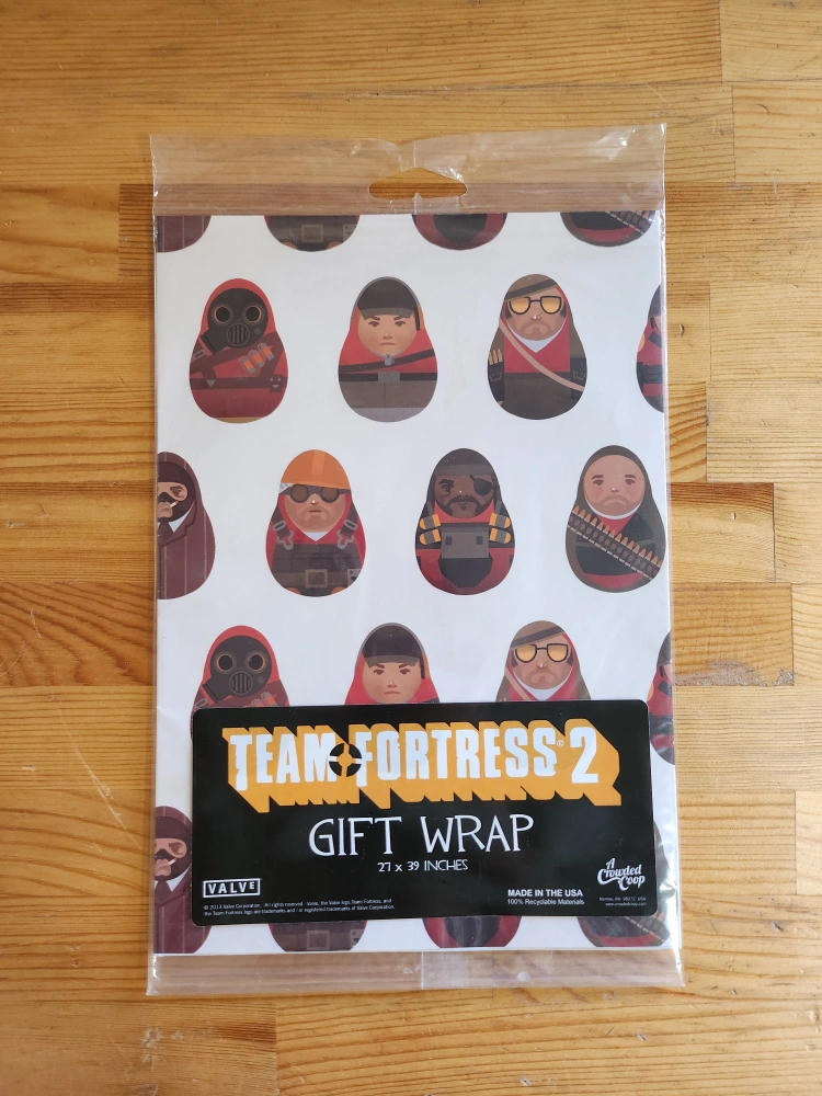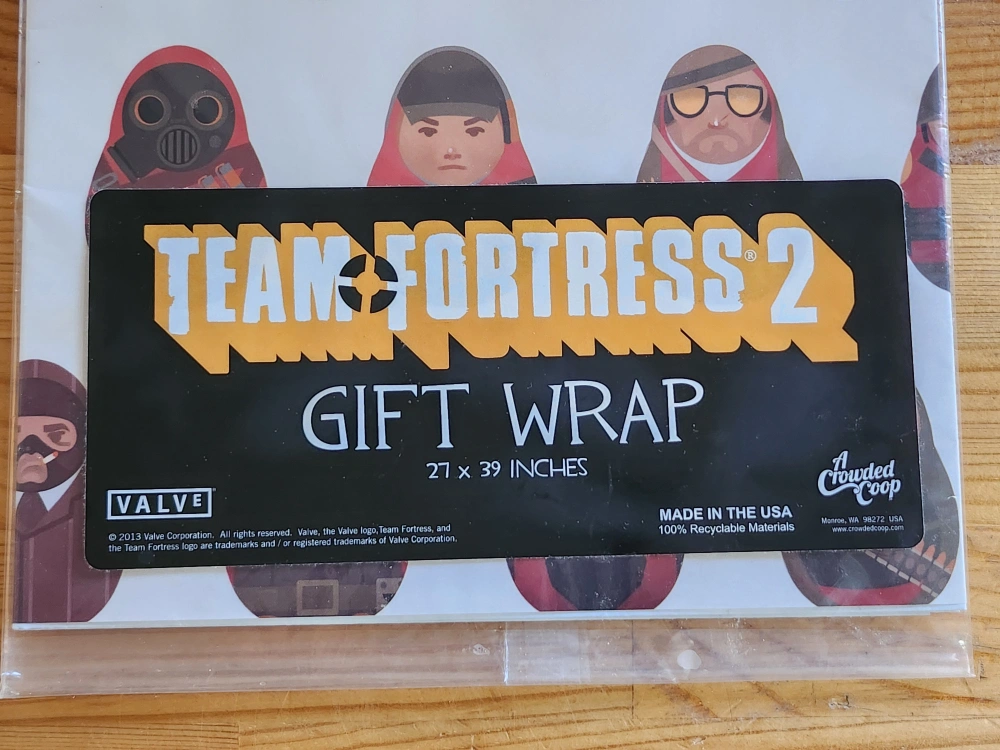 Brand new Team Fortress 2 gift wrap! It features a fun design with characters from the game as Russian nesting dolls. The gift wrap measures 27 x 39 inches and is made in the USA with 100% recyclable materials.